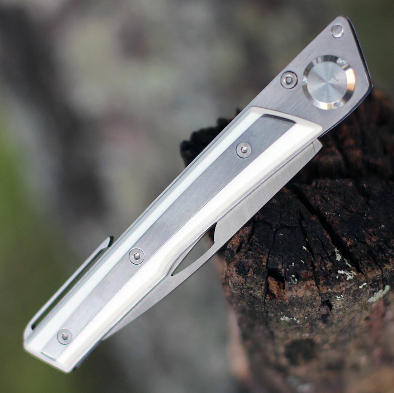Actilam S4CC Folder w/Clip, 3.375″ 14C28N Plain Blade, White Corian Handle