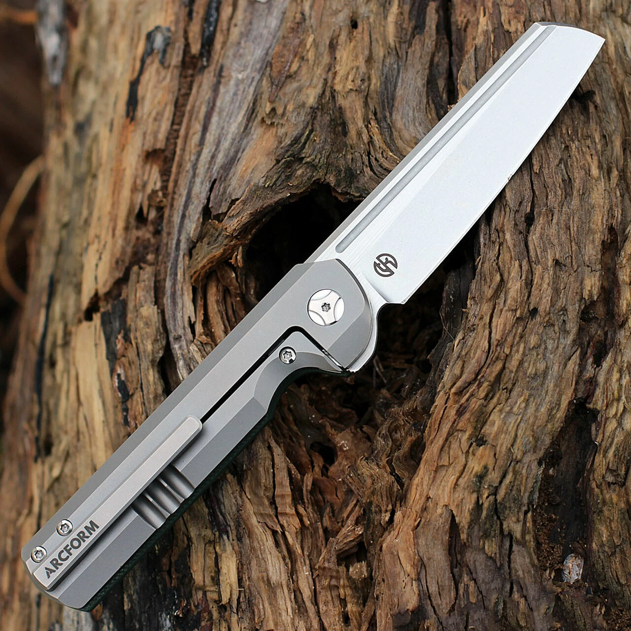 Arcform Slimfoot Folding – 3.5″ Bohler M390 Satin Sheepsfoot Blade, Titanium Framelock with Green G10 Peel-Ply Front Face