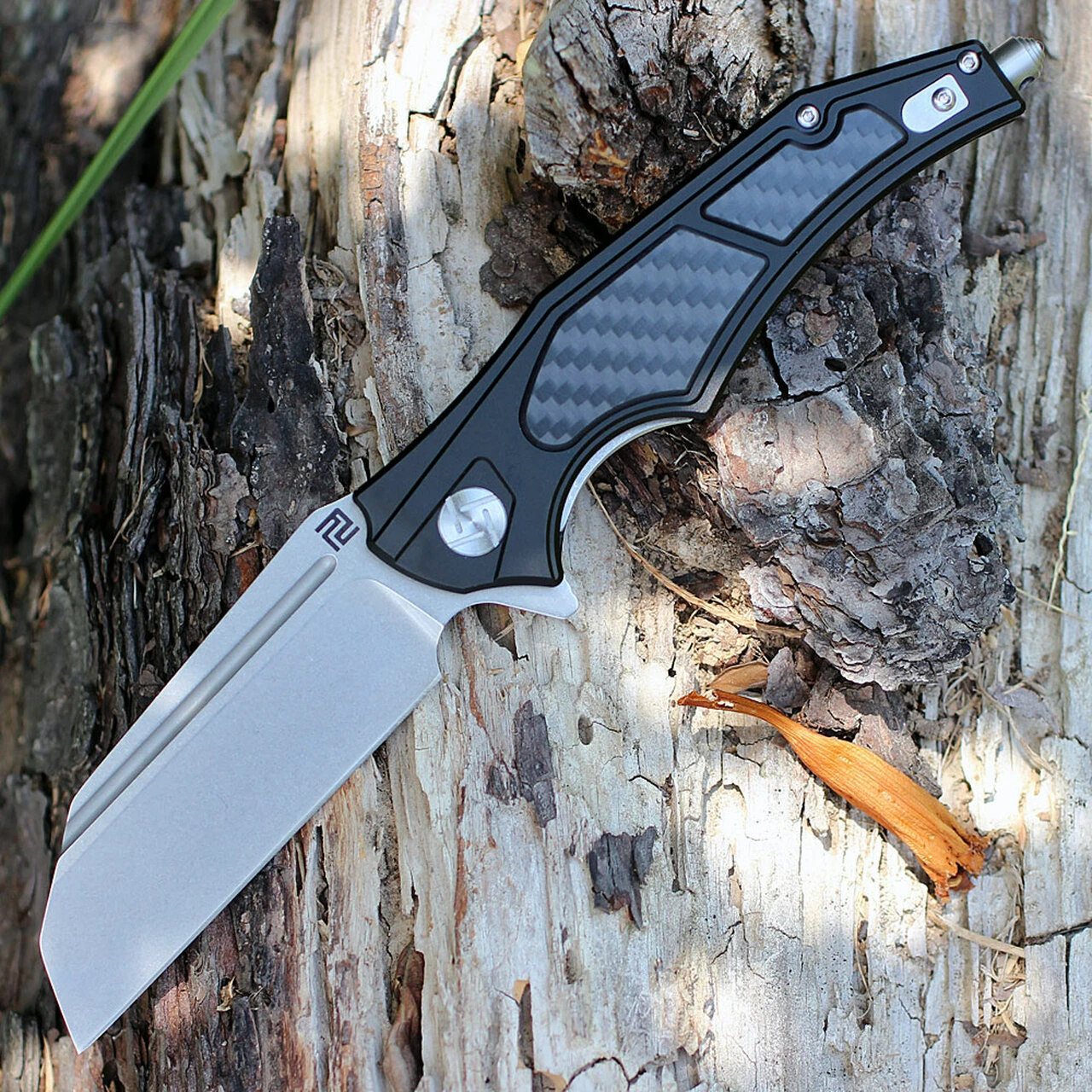 Artisan Apache ATZ1813PBCF, 3.7″ D2 Plain Blade, Black Aluminum/Carbon Fiber Handle