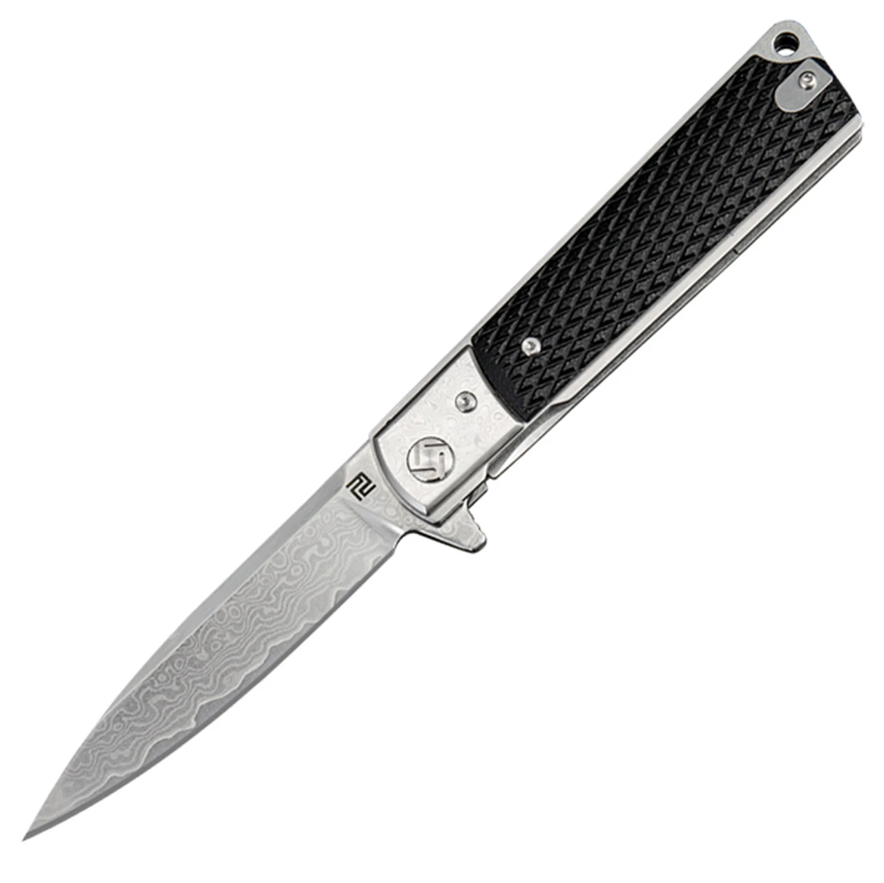 Artisan Cutlery Classic Folding Knife (ATZ-1802GDGL) – 3.94″ Damascus Drop Point Blade, Black G-10 Handle with Damasteel Bolster