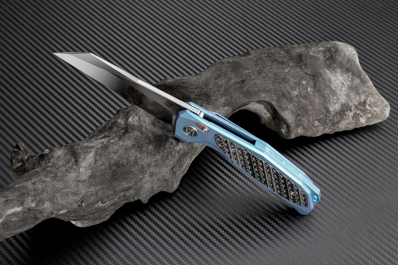 Artisan Falcon ATZ1809GBUS, 3.62″ S35VN Plain Blade, Blue Carbon Fiber/Titanium Handle