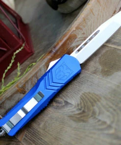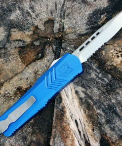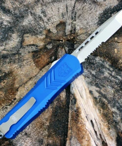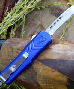 CobraTec Blue FS-X OTF Knife CTKMBLUFS-XMTS, 3″ D2 Steel Tanto Serrated Blade, Blue Aluminum Handle