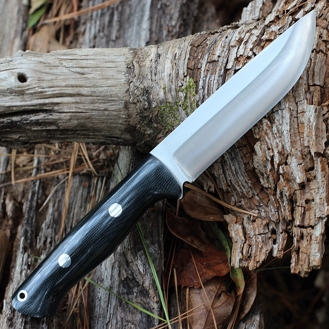This Bark River Bravo 1.25 Rampless is made with A2 steel blade and a black canvas micarta handle. The Bravo features a 5″
