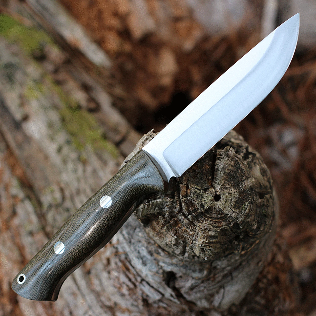 This Bark River Bravo 1.25 is made with A2 steel blade and a green canvas micarta handle. The Bravo features a 5″