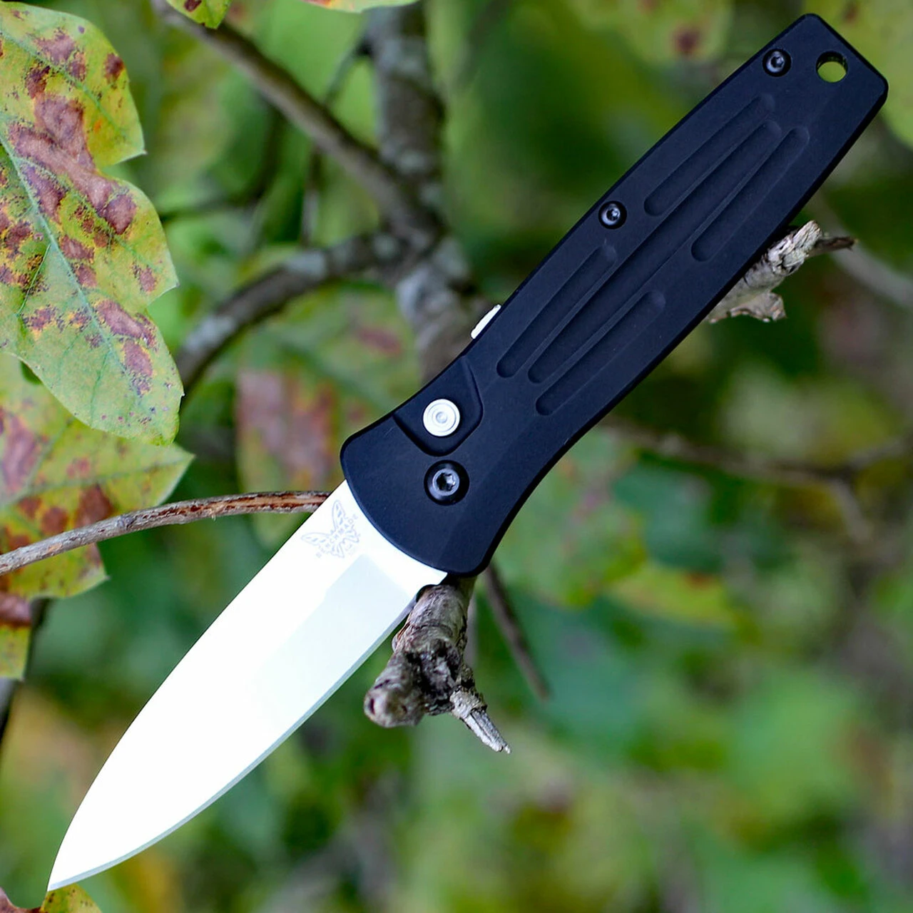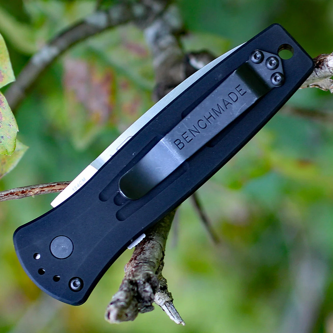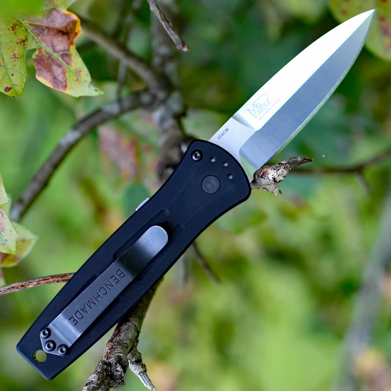 The original 3550 Pardue auto gets a new name and the upgraded Benchmade automatic package, the Stimulus 3551 is now made with increased reliability and improved access to an enlarged button. While the size is still small and light, the updated Pardue design still features the small size making it convenient for everyday carry. The 3551 Stimulus features a 2.98 inches long 154-CM stainless steel spear point blade that offers enhanced tip qualities (false double edge). Push-button automatic blade action snaps out fast. The black anodized 6061 T-6 machined aluminum handles are comfortable and thin. The sliding safety works without a hitch. 154CM is an American-made premium grade best all-around stainless steel that offers great corrosion resistance with good toughness and edge qualities. Specifications: