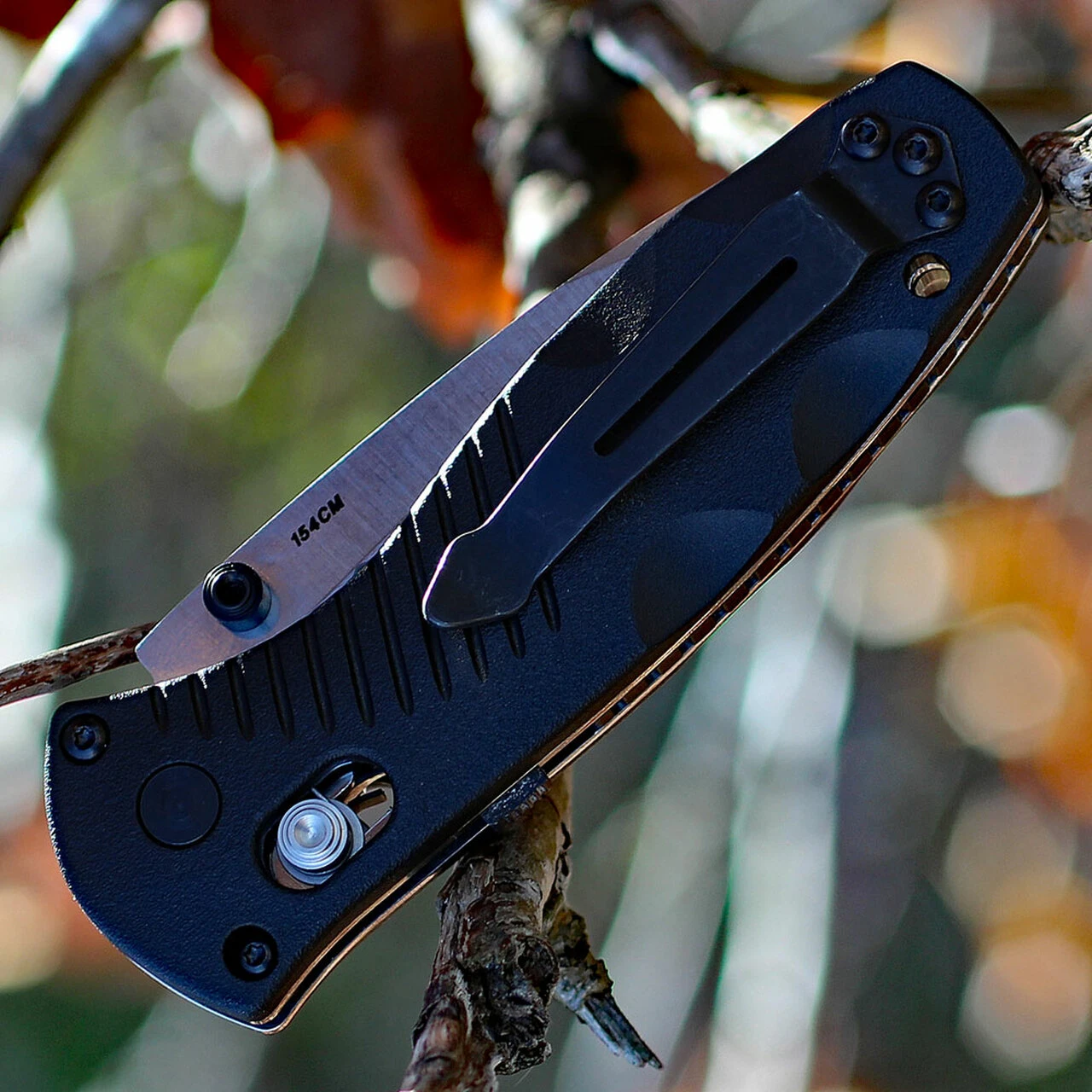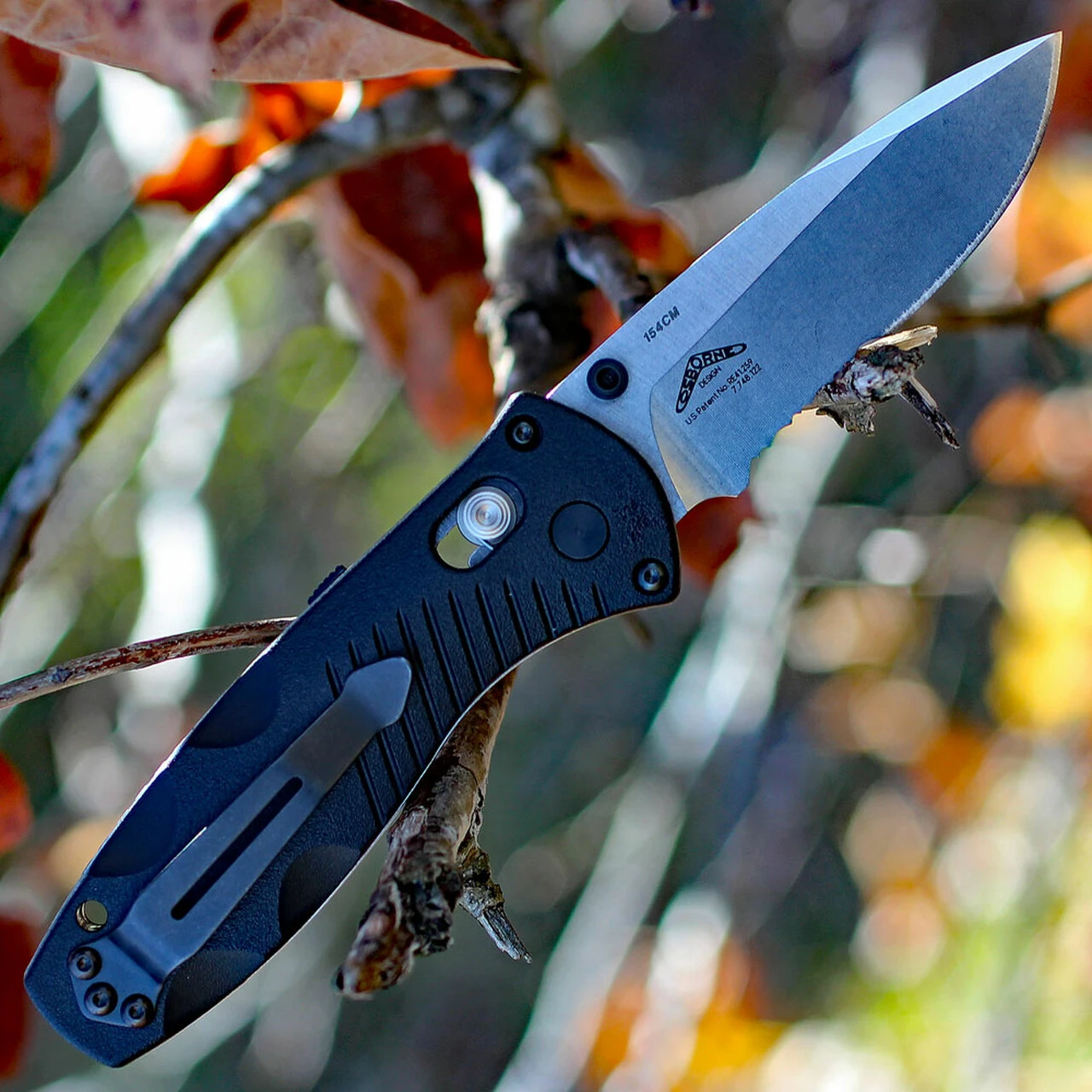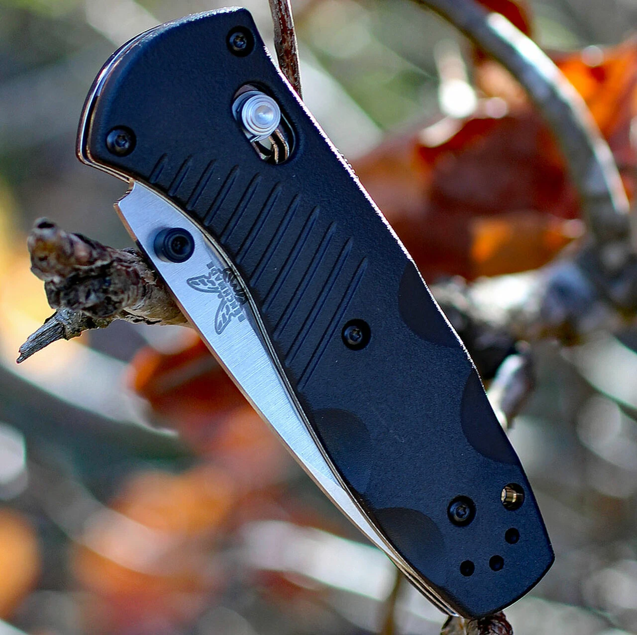 The Benchmade Barrage was introduced in 2009 which was the first AXIS-lock folding knife featuring an assisted-opening mechanism. The Barrage was designed by Warren Osborne, and this premium production folder was aimed at higher end users. Osborne has long been known for designing some of the best knives on the market and is one of Benchmade’s top designers. The Barrage is offered in a variety of combinations with different blade steels,handle materials, and sizes, you are sure to find the best fit for you. If you are worried about the size, there are two different sizes to choose from. The Barrage overall length is 8.35 in. and the Mini Barrage length is 6.91 in. Whether you have large or small hands, either size of the Barrage will fit your hand. Benchmades Barrage Models; 580, 583, and 585 are manufactured with American-made, premium 154CM stainless steel.An American-made premium grade stainless steel originally developed for tough industrial applications. Known for its best all-around qualities, it offers great corrosion resistance with good toughness and edge quality.The lightweight handle is made from Valox, a glass-filled nylon, and rides easy in the pocket. The textured handle is a blend of ergonomics and style, and provides a firm grip. Its finger indents, or scallops, a feature of Osborne knives, allow the hand to rest easily on the back of the handle. The handles full-length, stainless steel liners are skeletonized to reduce material and provide structure with minimal weight. The Barrage knives were the first folders with both an AXISlock and a spring assist. The AXIS lock is generally considered the strongest locking mechanism available on a folding knife. By adding a spring assist, Benchmade gives the user two great featuresspeed (with the assist), and strength.