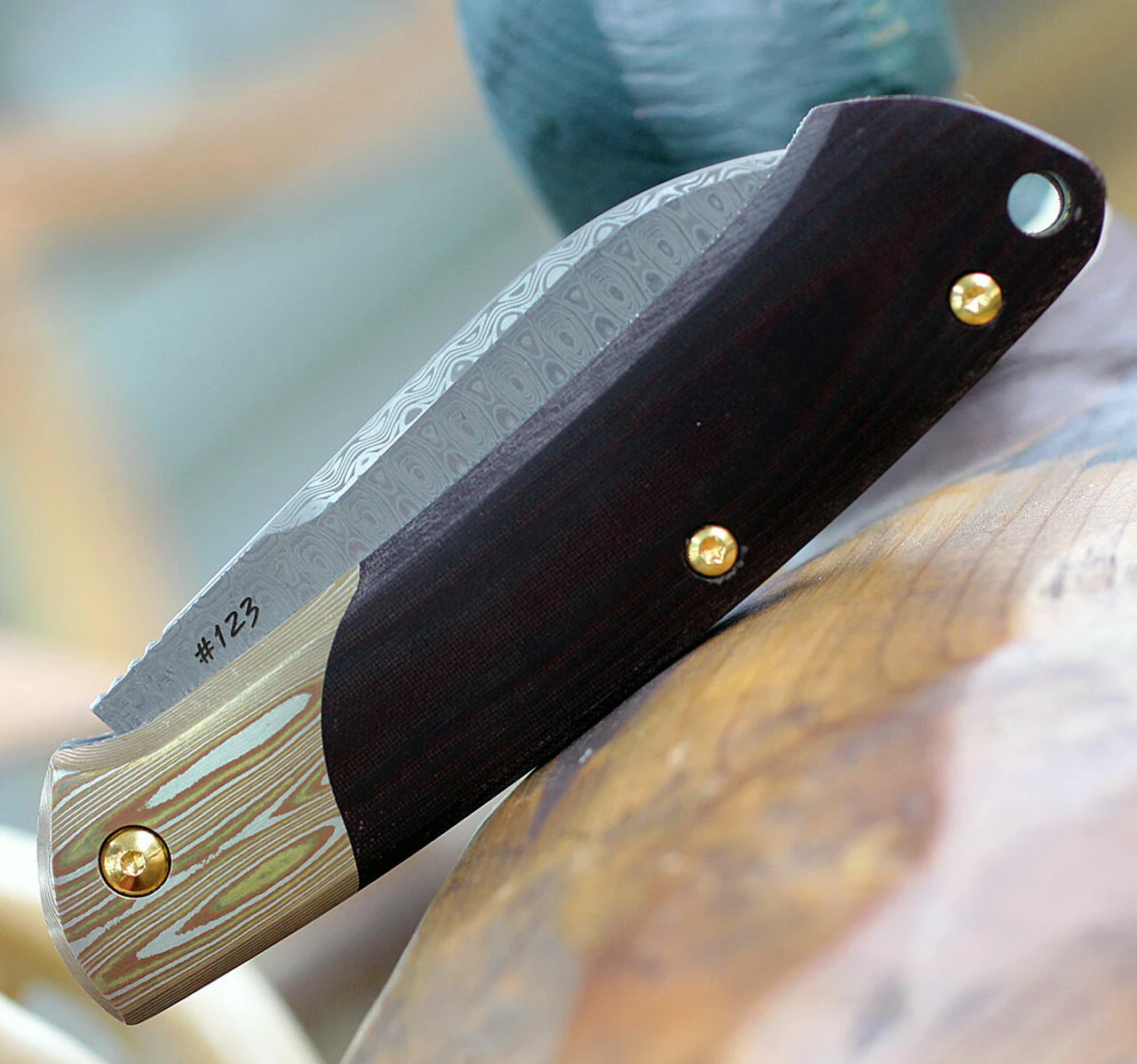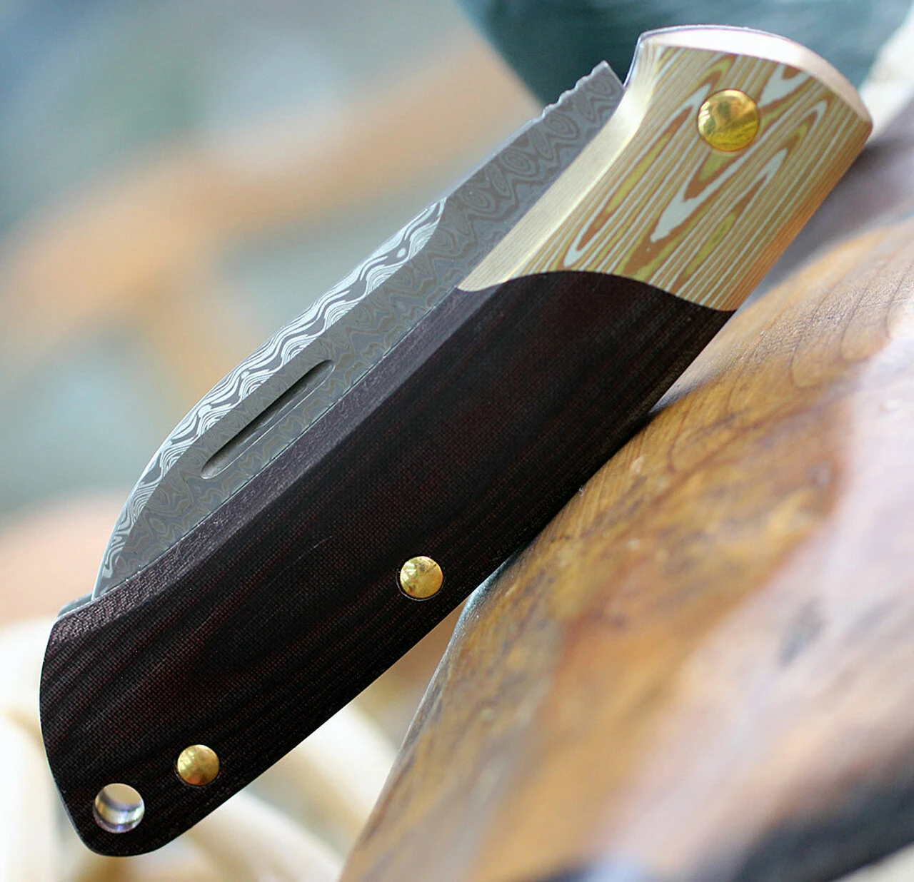Benchmade Proper 319-201 Gold Class – Burgundy and Black Linen Micarta (2.82″ Damascus) Mokume Bolster