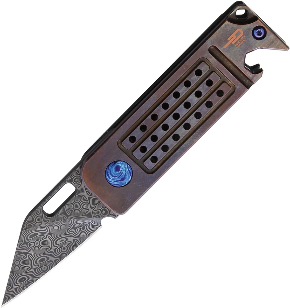 Bestech Ball Lock (BT2008B) – 1.75″ Damascus Steel Wharncliffe Blade, Brown Titanium Handle w/ Blue Accessories