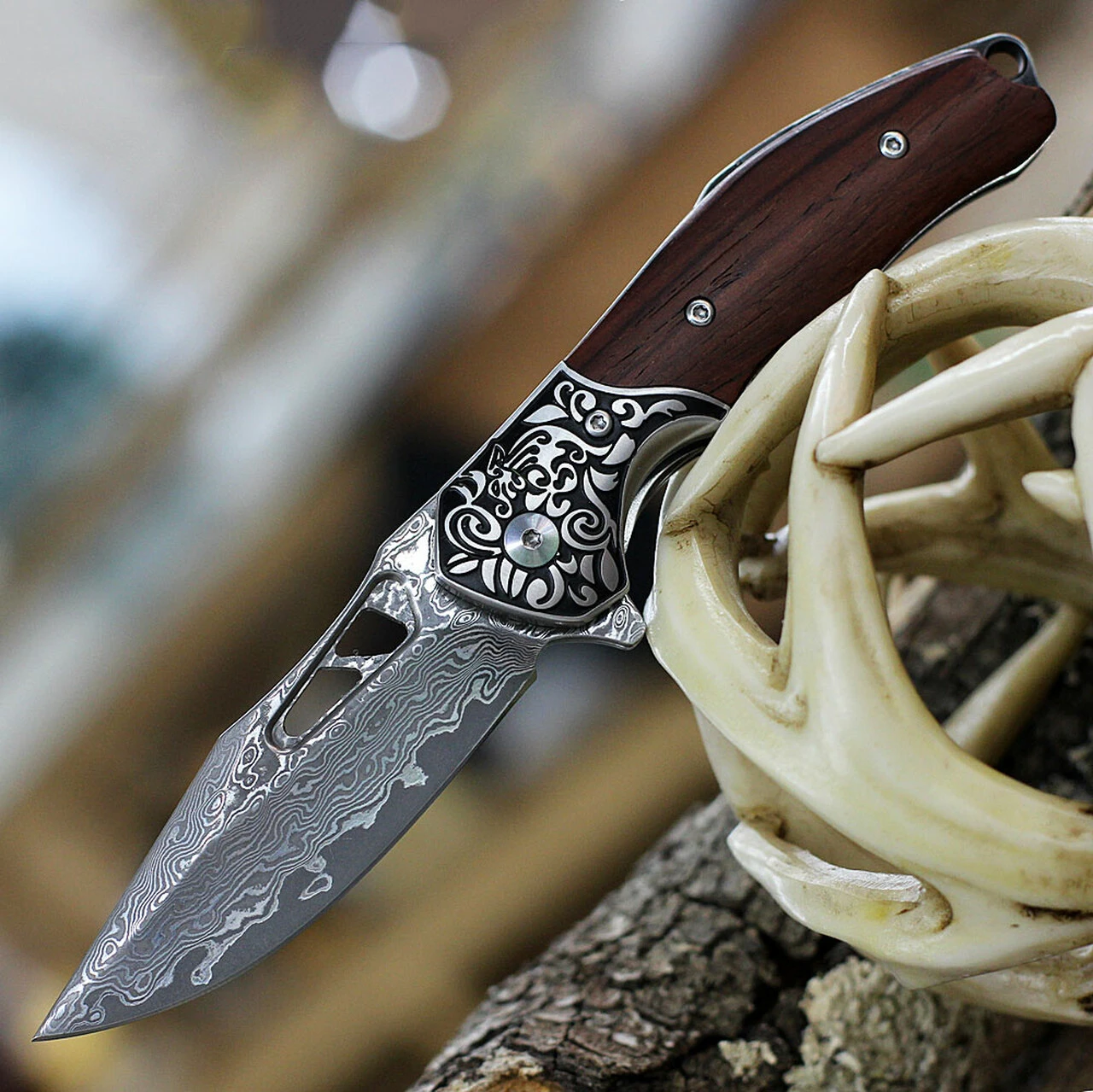 Bestech Draco Folding Knife (BG48) – 3.2″ Damascus Clip Point Blade, Stainless Steel Handle and Bolster with Wood Scales