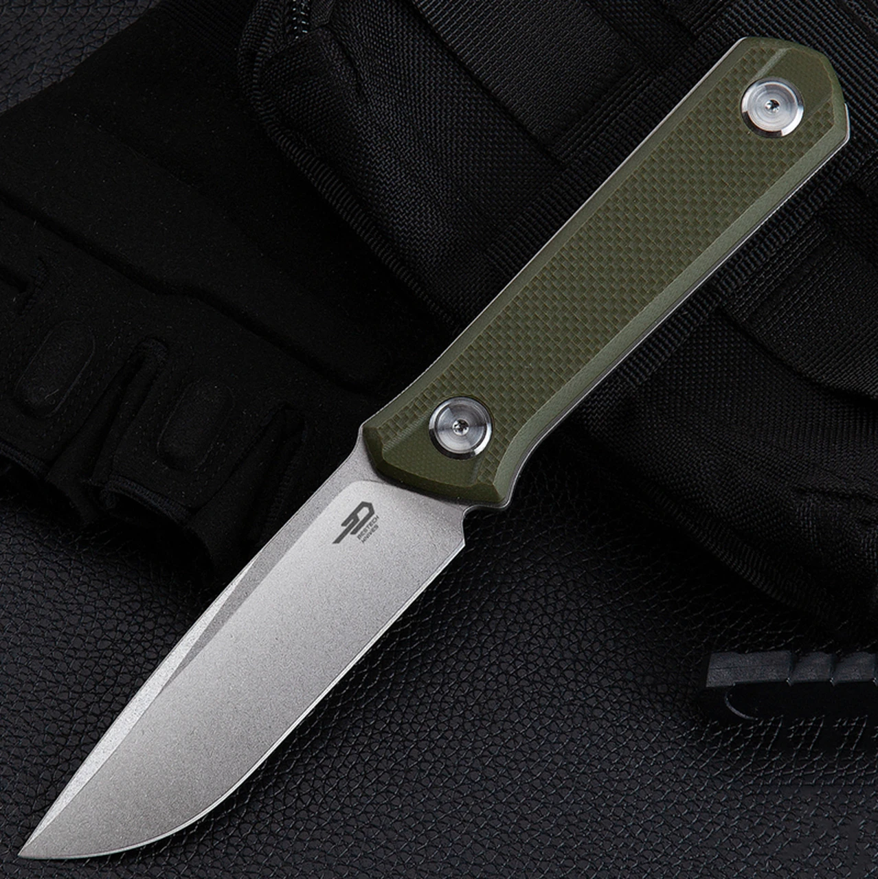 Bestech Hedron (BFK02b) – 3.75″ D2 Stonewashed Drop Point Fixed Blade, OD Green G-10 Handle, Black Kydex Sheath