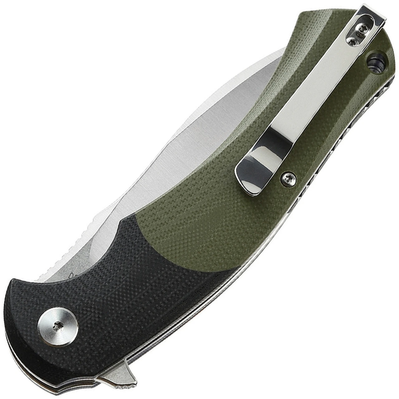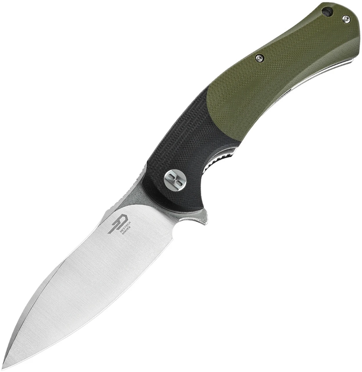 Bestech Knives Penguin Flipper Knife BG32A, 3.6″ D2 Satin & Stonewash Plain Blade, Green & Black G-10 Handle