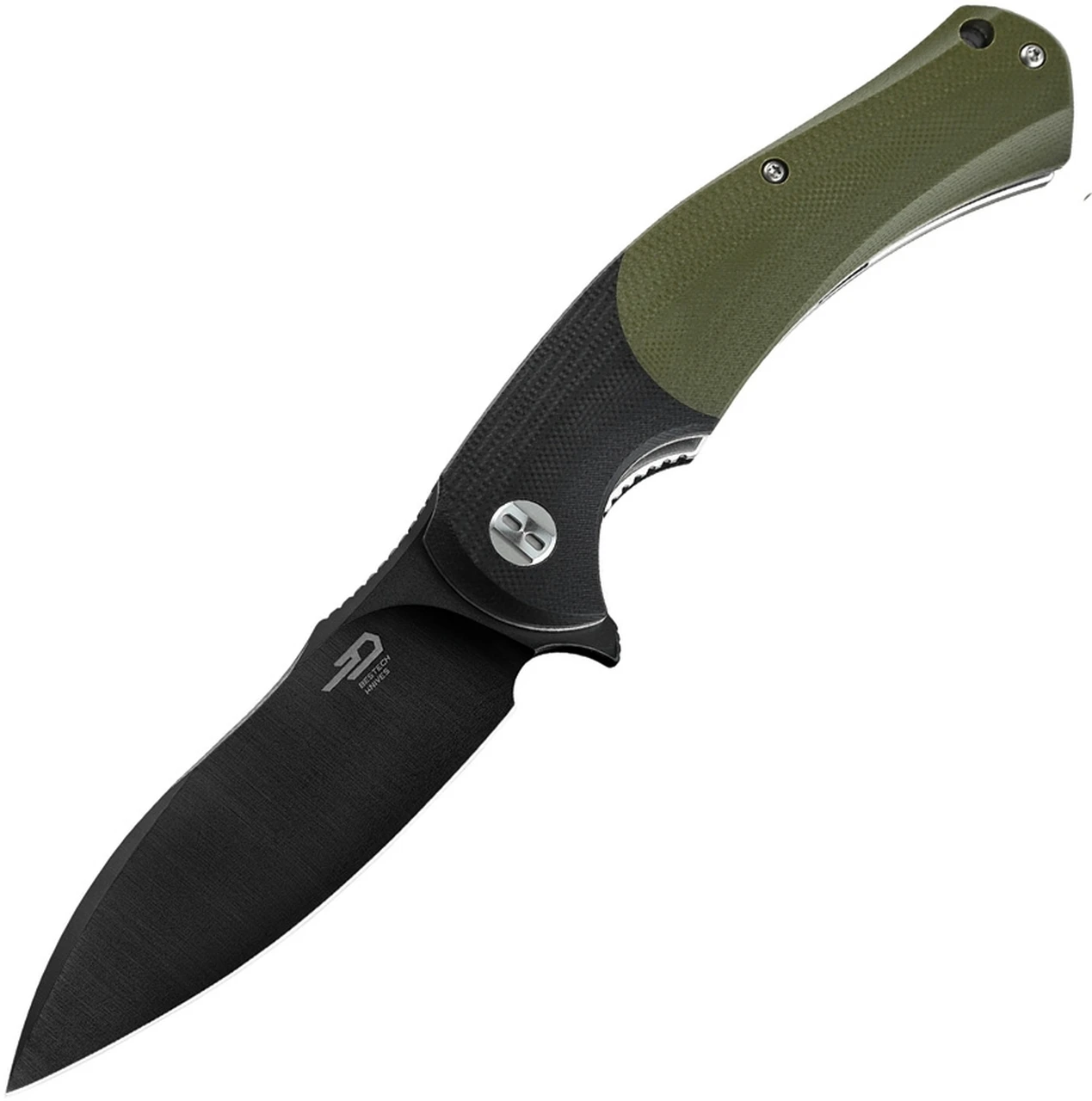 Bestech Knives Penguin Flipper Knife BG32E, 3.6″ D2 Black Plain Blade, Black & Green G-10 Handle
