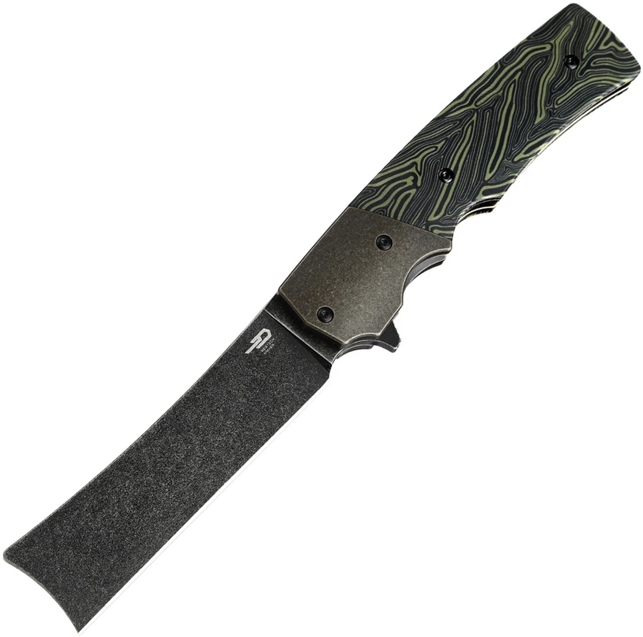 Bestech Knives Spanish Tip Razor BT2101E, 3.66″ M390 Black PVD Coated Blade, Black & Green G-10 Handle with Titanium Bolsters