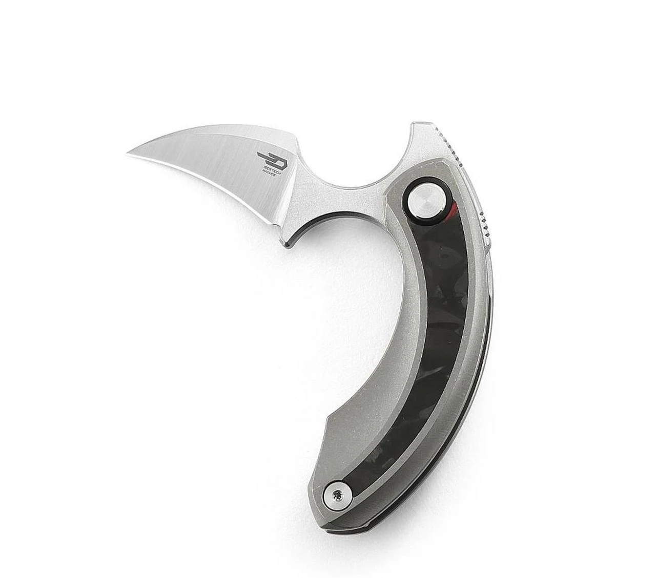 The Bestech Strelit is a folding knife that aquires a hawkbill M390 blade. The unique handle is made out of titanium with black and red carbon fiber inlay. This knife uses high quality materials with excellent fit and finish as well as locking mechanism.