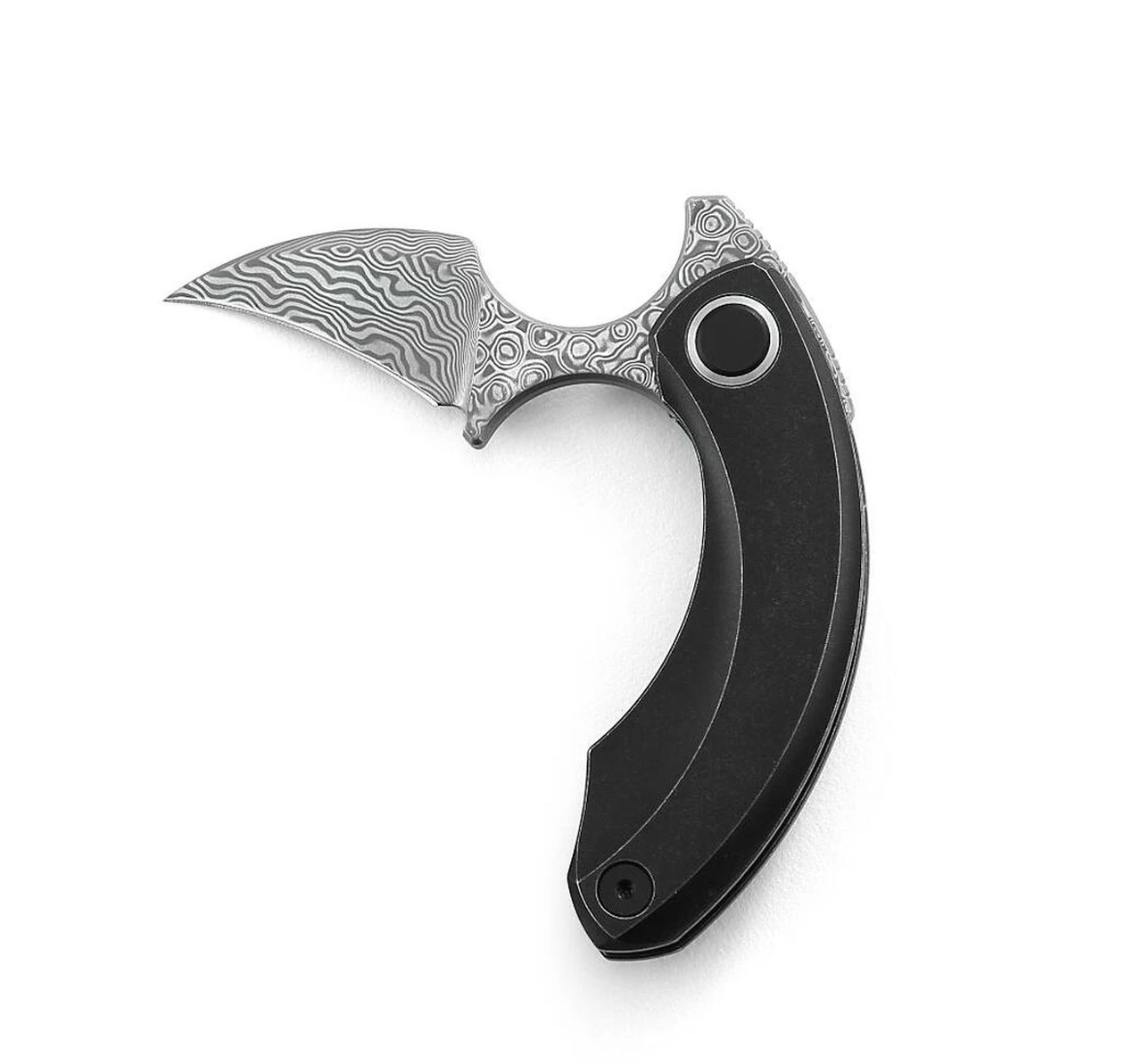 The Bestech Strelit is a folding knife that aquires a hawkbill damascus blade. The unique handle is made out of 6AL4V titanium with a black stonewashed look. This knife uses high quality materials with excellent fit and finish as well as locking mechanism.