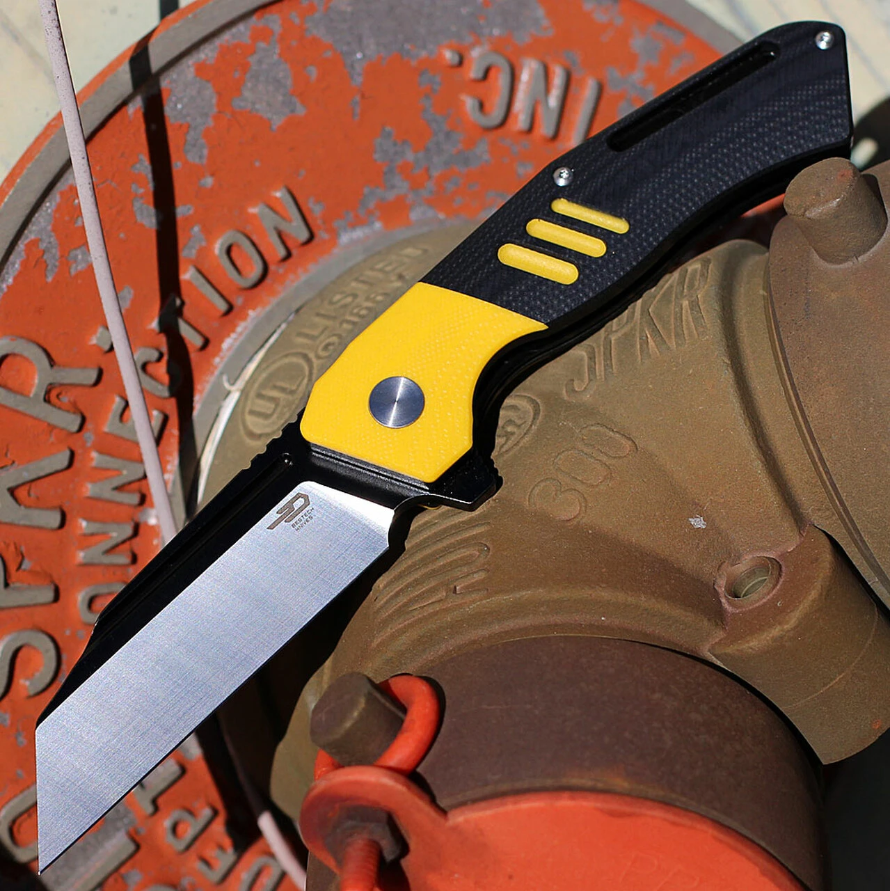 Bestech Rockface Liner Lock Folding Knife (BG46A) – 3.4″ D2 Two Tone Wharncliffe Blade, Black & Yellow G10 Handle
