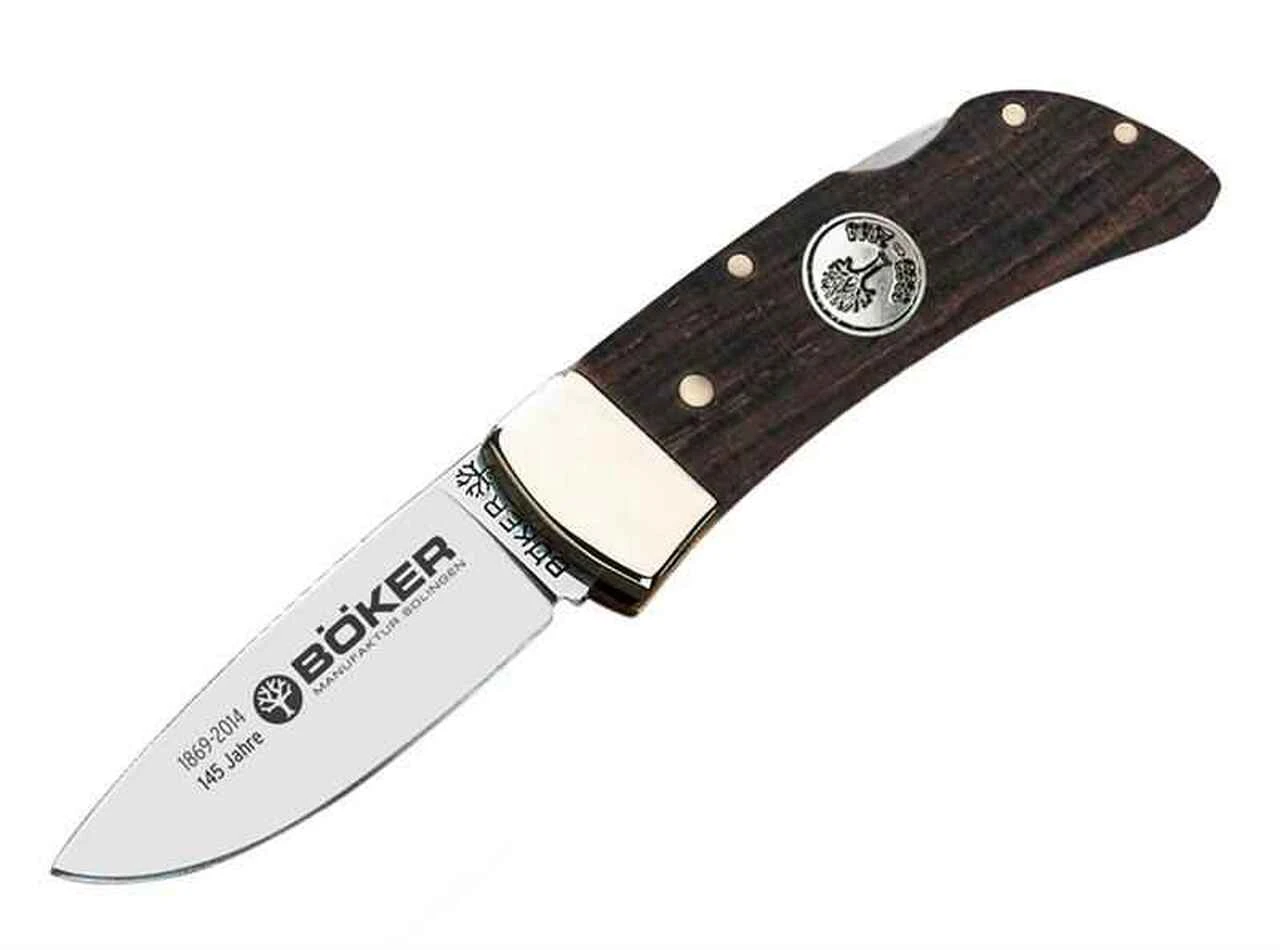 The Boker 145th Anniversary Pocket Folder is the perfect premium pocket knife for the three-piece suit, jeans, or purse. It features a high polish stainless steel blade, Boker’s very special Grenadill wood scales and nickel silver bolsters and liners. The scales are highlighted with an exquisite sterling silver emblem showing the years 1869-2014. The blades are high polished and carry a unique laser engraved 145 year anniversary logo. It comes in a special presentation package, serial numbered and with a certificate of authenticity.
