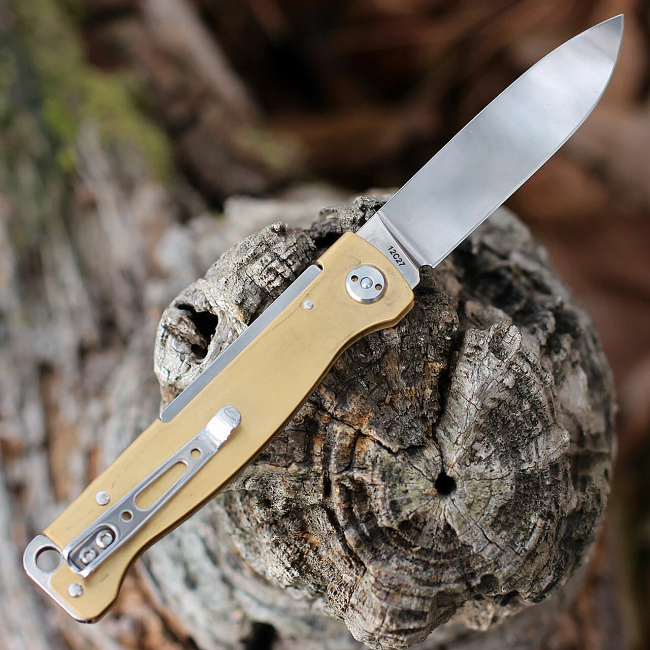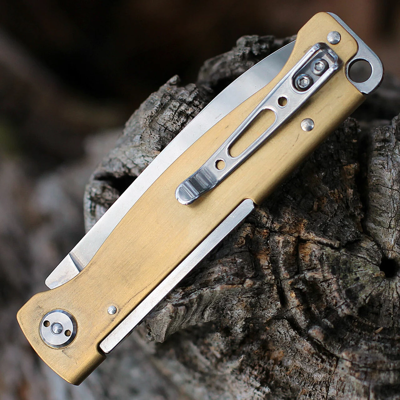This no-frills Boker Plus Atlas is a reliable slip joint pocket knife with a sleek brass handle body complete with satin finish. The minimalist construction is extremely robust and makes this handy knife the perfect companion in all situations. The satin finished drop point blade, made of 12C27 steel, is opened by nail nick and can easily