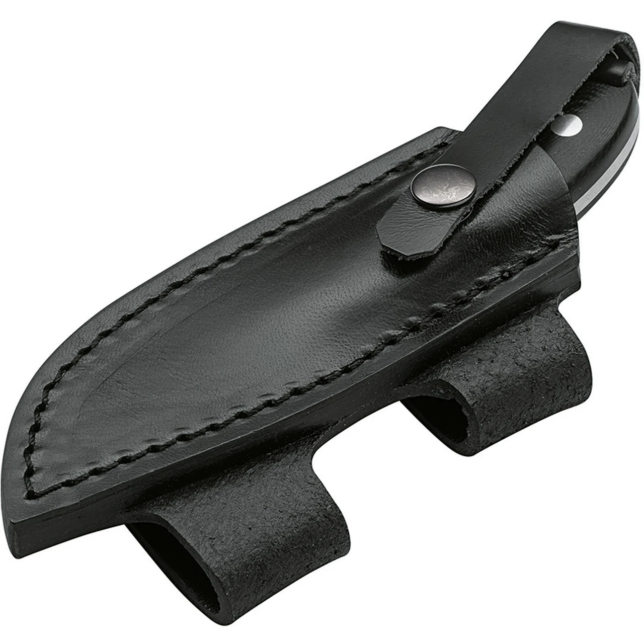 Designed by Greg Dash, the Boker Plus J-Bite is an extremely compact EDC knife that is worn horizontally on the belt and is also ideal for hunting or outdoor activities. The American knifemaker from New York has been enthusiastic about knives since his early youth and is always looking for practical innovations and improvements. The handy J-Bite is equipped with a satin-finished Clip Point blade made of 440C with a decorative ricasso. The handle made of black G10 fits comfortably in the hand despite its small size. To secure the knife in the horizontal carrying position, the designer developed the so-called J-Lock. A catch strap at the end of the handle is attached to the black leather sheath and prevents the knife from slipping out unintentionally.