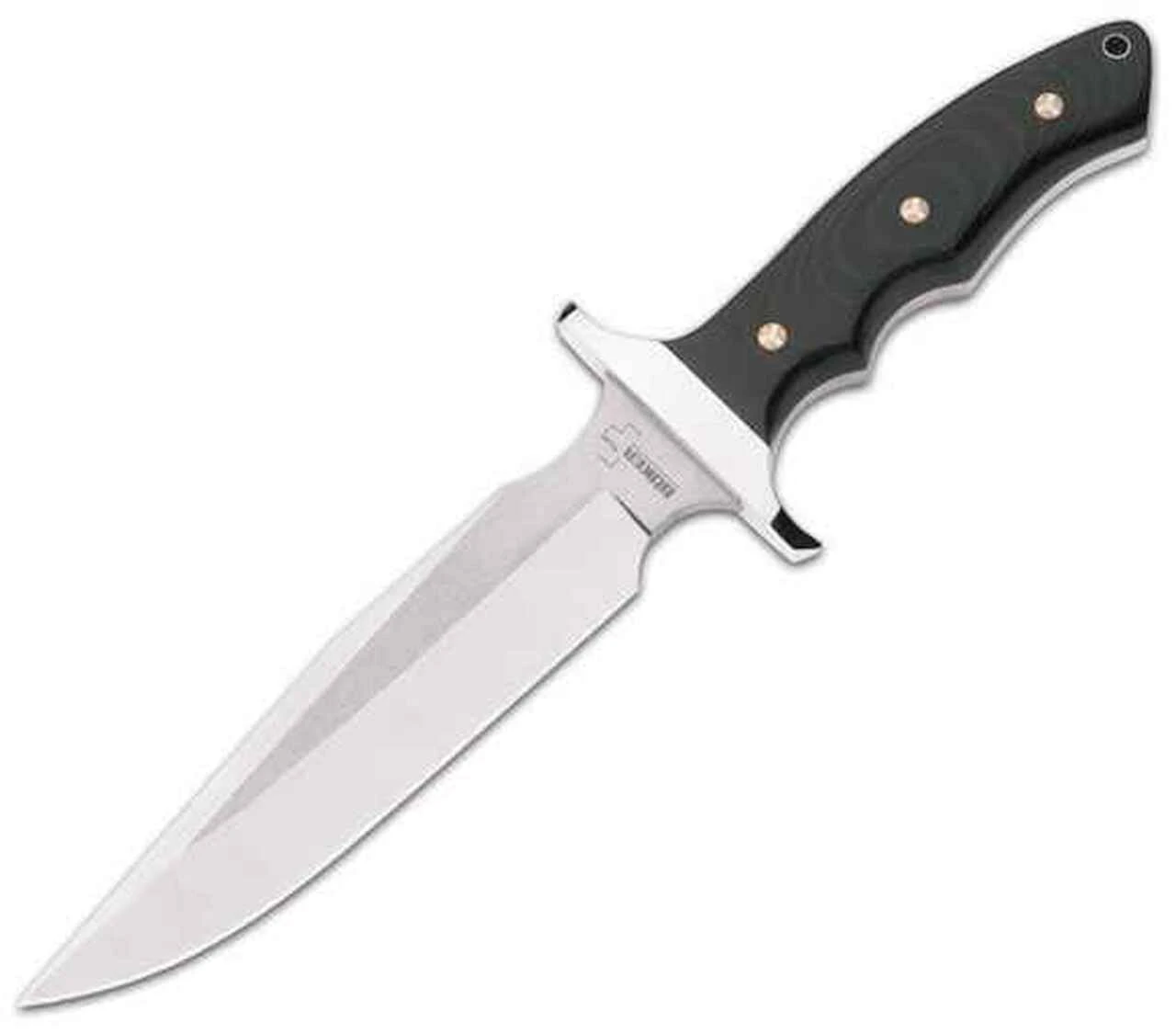 A modern interpretation of the classic Vietnam bowies, from Boker Plus. The blade features a satin finish going off into two different directions (for a two-tone finish), and in impressive thickness of 6mm, and is made of 440C stainless steel with excellent edge-holding capability. The crossguard is made of stainless steel and offers plenty of safety, even under rugged field use. The extensively ground Micarta handles are ergonomically shaped for a comfortable and secure grip, and contain a red fiber layer underneath. The handles are fastened to the tang by the use of mosaic pins, which are ordinarily only seen on custom knives due to costly production, and create a unique appearance. A must-have for the collector! With its approved concept and sturdy dimensions it can also be used as a reliable outdoor knife for a variety of cutting chores. Includes lanyard hole and premium genuine leather sheath.