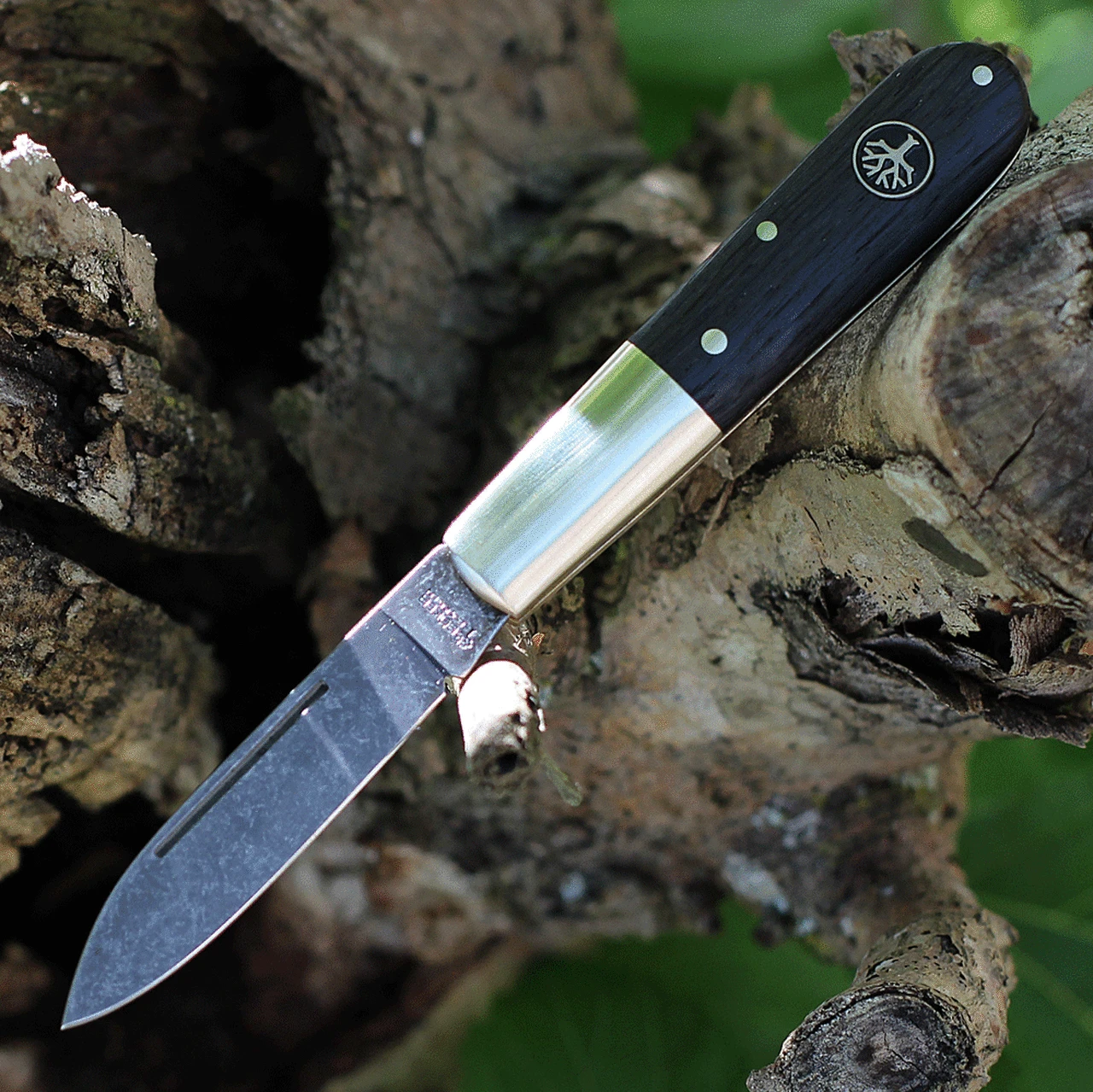 The classic Boker Barlow with its characteristic bolsters made of nickel silver is equipped here with a comparatively narrow blade made of non-stainless C75, which convinces with outstanding cutting durability and easy re-sharpening. The blade has a dark acid-wash finish, is opened with two hands by nail nick, and does not lock. The high-quality handle scales are made of dark bog oak wood and thus form a beautiful contrast to the bolster. On the one hand, this handy pocket knife is a small companion that is absolutely suitable for the trouser pocket, but on the other hand, it is also big enough to handle almost all cutting jobs in everyday life without any problems.
