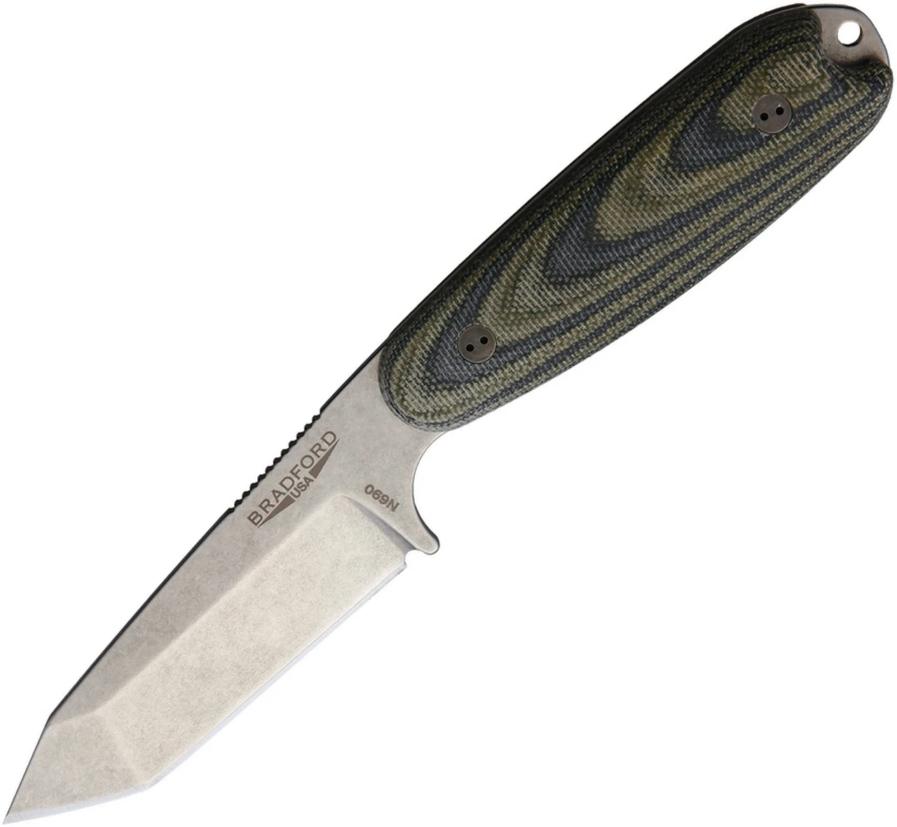Bradford Guardian 3.5 Tanto Stonewashed N690 Blade, Camo Canvas Micarta Handle w/Brown Leather Sheath
