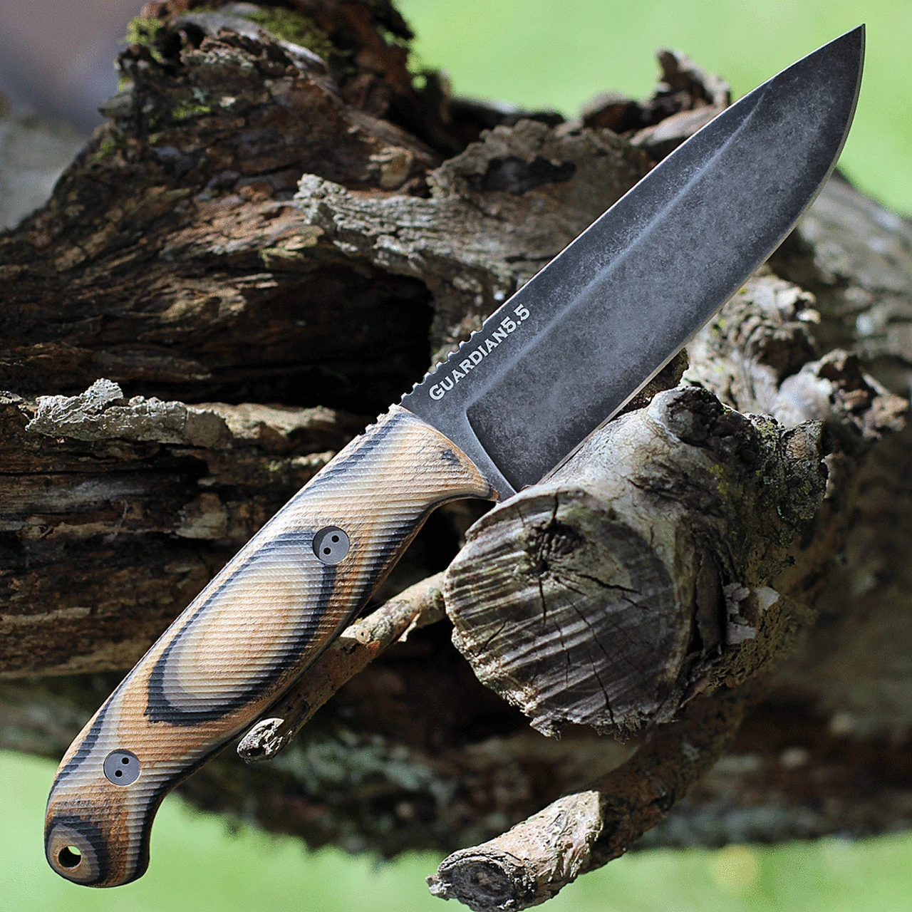 This Guardian5.5 features 5.0 inch 3Vsteel fixed blade with a full tang has a stonewashed blade with a sabre grind. Comes with an perfect horizontal leather carry sheath with plastic insert for proper blade alignment.