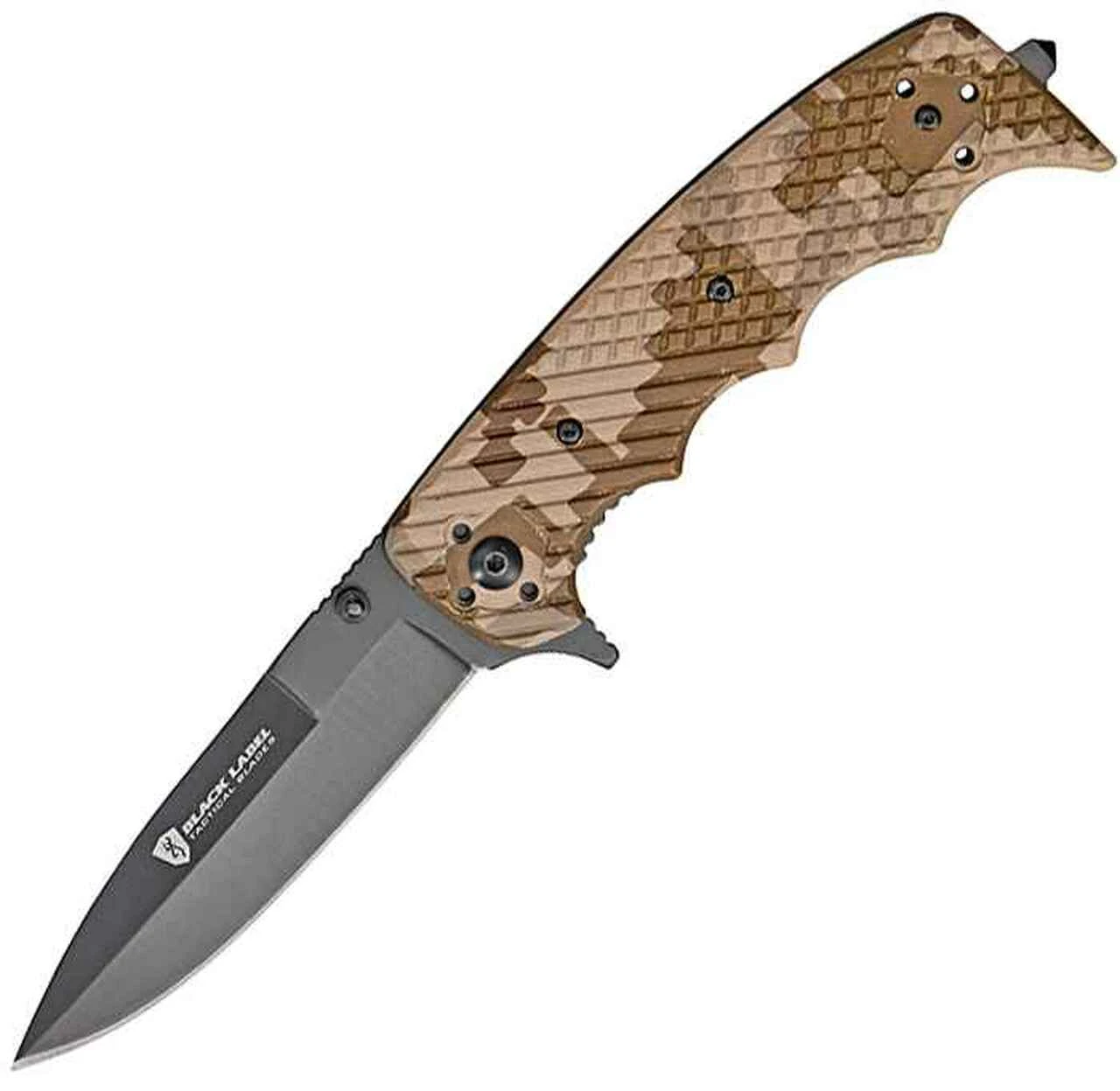 440 stainless, black oxide finish spear point blade with dual thumb studs and extended tang. Brown digital camo finish textured G-10 handles with integrated window punch. Four way reversible black finish stainless pocket clip.