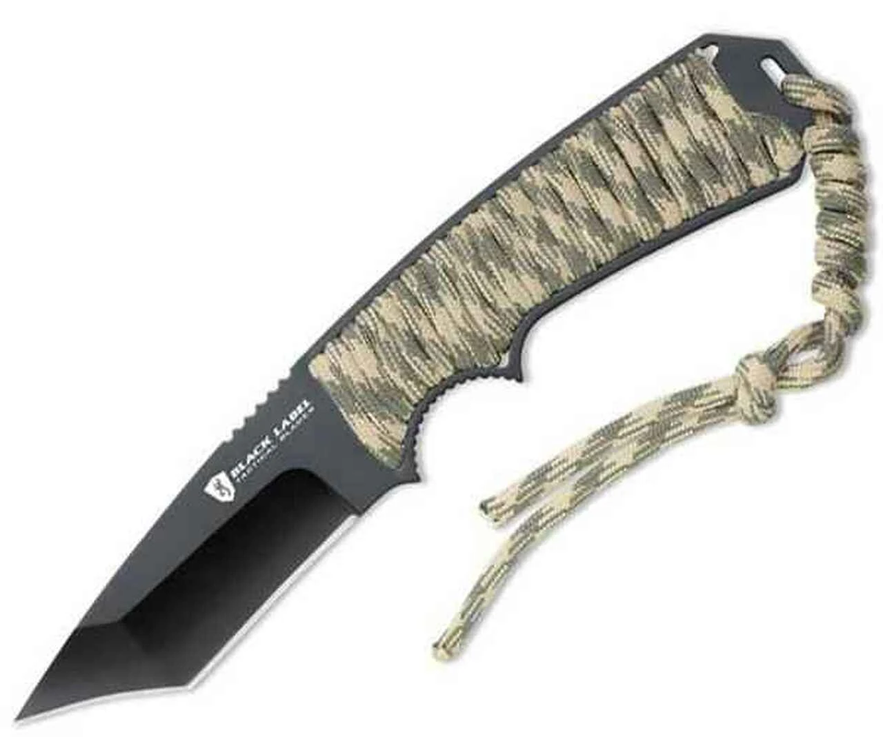 A slashing fixed blade fang for close-in defense, the Browning First Priority features a sleek tanto point blade crafted of matte black 440 stainless steel with a hollow grind, a serrated index finger groove, sleek front guard plus a squared pommel with lanyard loop. The finger-grooved handle is a full tang design and is hand-wrapped with durable desert camo paracord for a sure grip in all conditions. The matte black Blade-Tech molded polymer sheath allows you to position the First Priority at virtually any angle and mounts securely to your belt, web gear or tactical vest. Make your close-up defensive capability a First Priority.