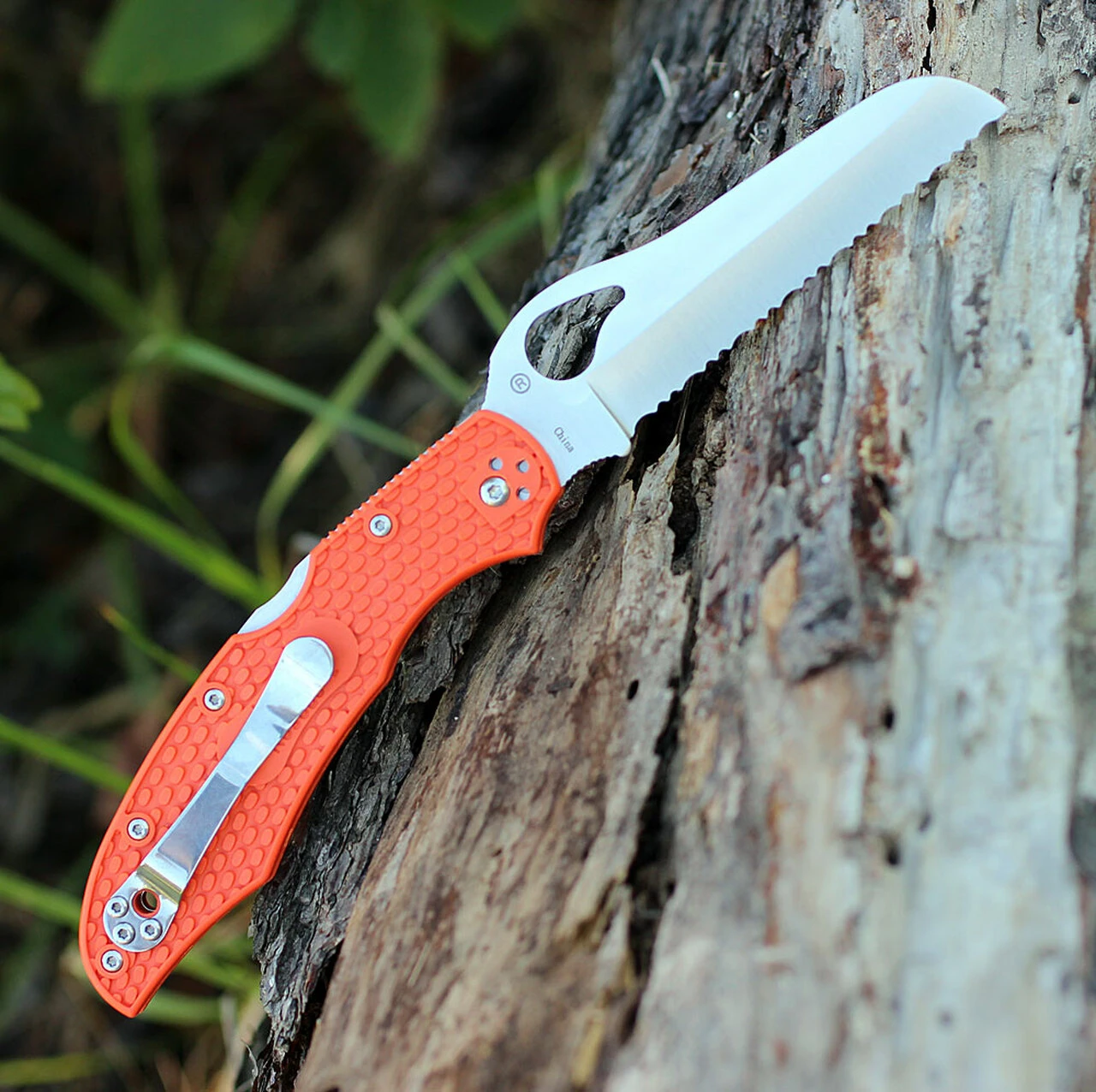 The Cara Cara 2 Rescue model has long been the go-to choice for first responders and prepared civilians who want a trustworthy rescue cutting tool at an affordable price. Now this incredibly popular knife is available with a high-visibility orange handle that makes it even easier to access is a critical situation. Its fully serrated sheepfoot blade cuts with aggressive authority and makes short work of seat belts, rope, webbing, and other fibrous materials. Its blunt tip allows it to be used safely around accident victims and prevents puncturing of rafts and other flotation gear. The blade is supported by a textured, fiberglass-reinforced-nylon handle and sturdy back lock mechanism that locks it securely open during use. A four-position clip that supports left or right-side tip-up or tip-down carry ensures that the knife is always poised and ready. It also complements the blade’s fully accessible comet-shaped hole to make every aspect of this knife’s carry, deployment, and operation completely ambidextrous.