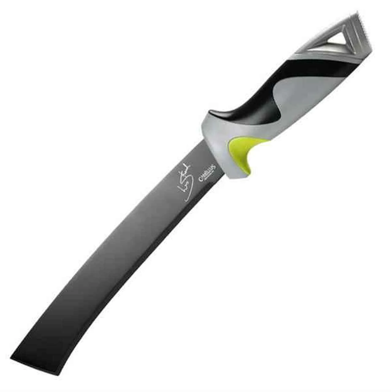 Camillus Les Stroud SK Jungle Survival Machete. 18″ overall. 11 3/4″ carbonitride titanium bonded 440 stainless non-stick curved machete blade. Full tang. Black and grey textured TPR handles with yellow finger notch. Knurled steel pommel with lanyard hole. Hard ballistic nylon sheath with fire starter and trail map mesh pocket.