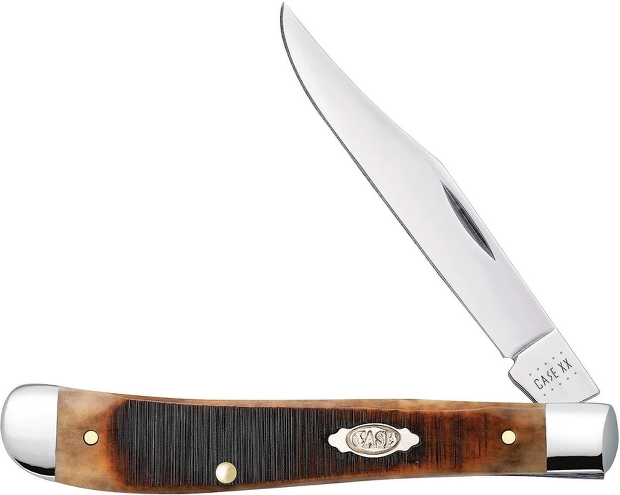 This Case Molasses Slimline Trapper looks incredible as a result of the pairing of the dark brown Molasses bone with the Case Traditional Shield. This knife features mirror-polished Tru-Sharp surgical steel blades, nickel silver bolsters along with brass pins and liners. It is perfect for an everyday carry or to add to any collection.