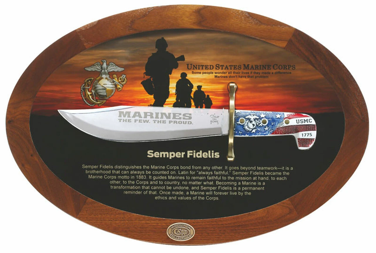 This licensed product honors Americas Expeditionary Force in Readiness, a most formidable branch of the U.S. military that began in 1775. The pocket knives represent these brave forces, with genuine bone handles, a unique shield, and a themed blade embellishment. The new Bowie Commemorative will make them shout, OO-RAH