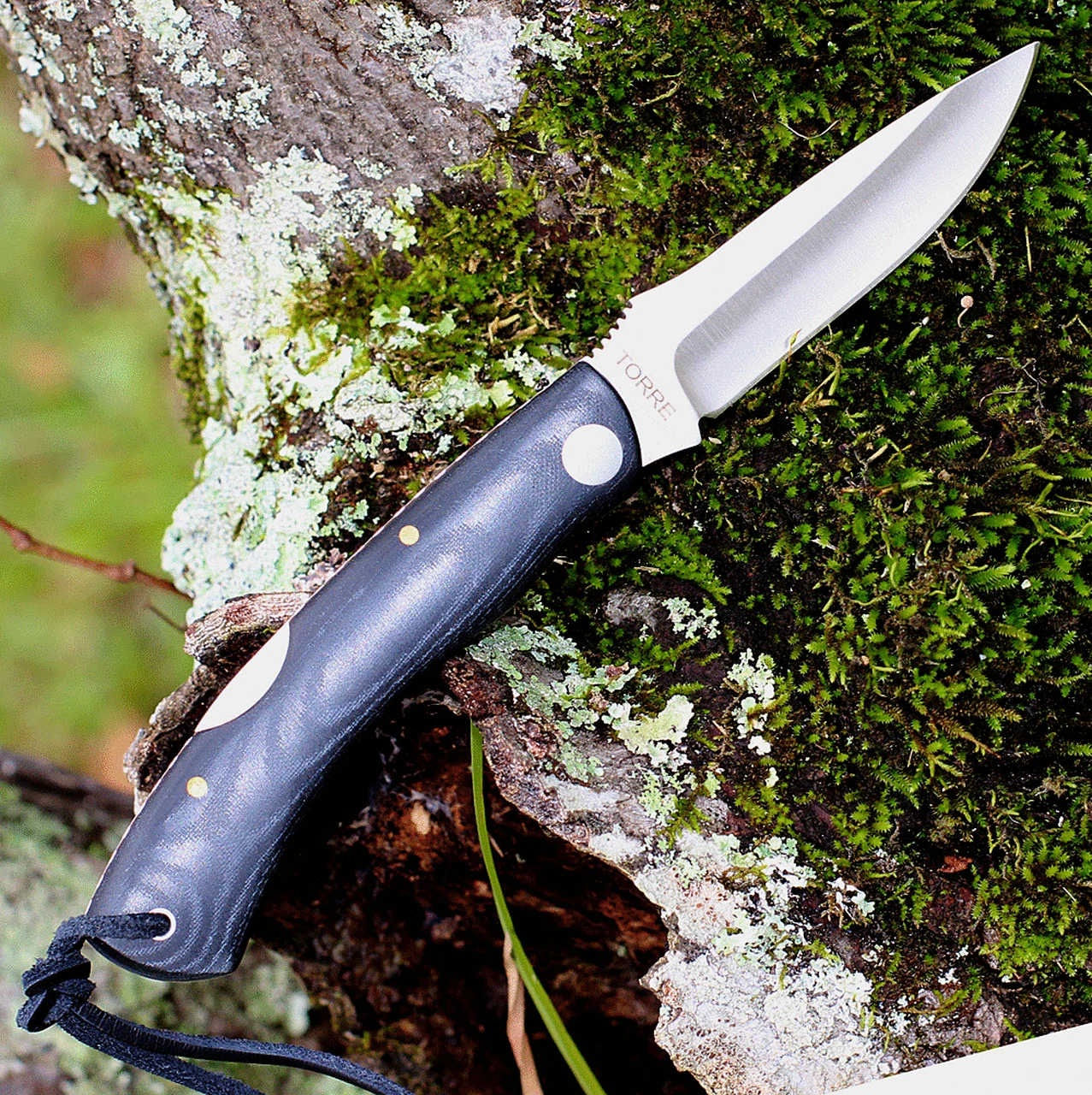 The Castillo Knives Torre is a modern interpretation of the classic Albacete knife, which was originally designed for a variety of domestic and rural uses. The aggressive jimping on the thumb ramp allows for easy blade manipulation regardless of the task. The Torre features a 3″ Sandvik 14C28N stainless steel drop point blade and curly birch handles. It is designed to be opened with two hands and has a solid lockback mechanism. The Torre comes complete with a leather lanyard and brown leather sheath.