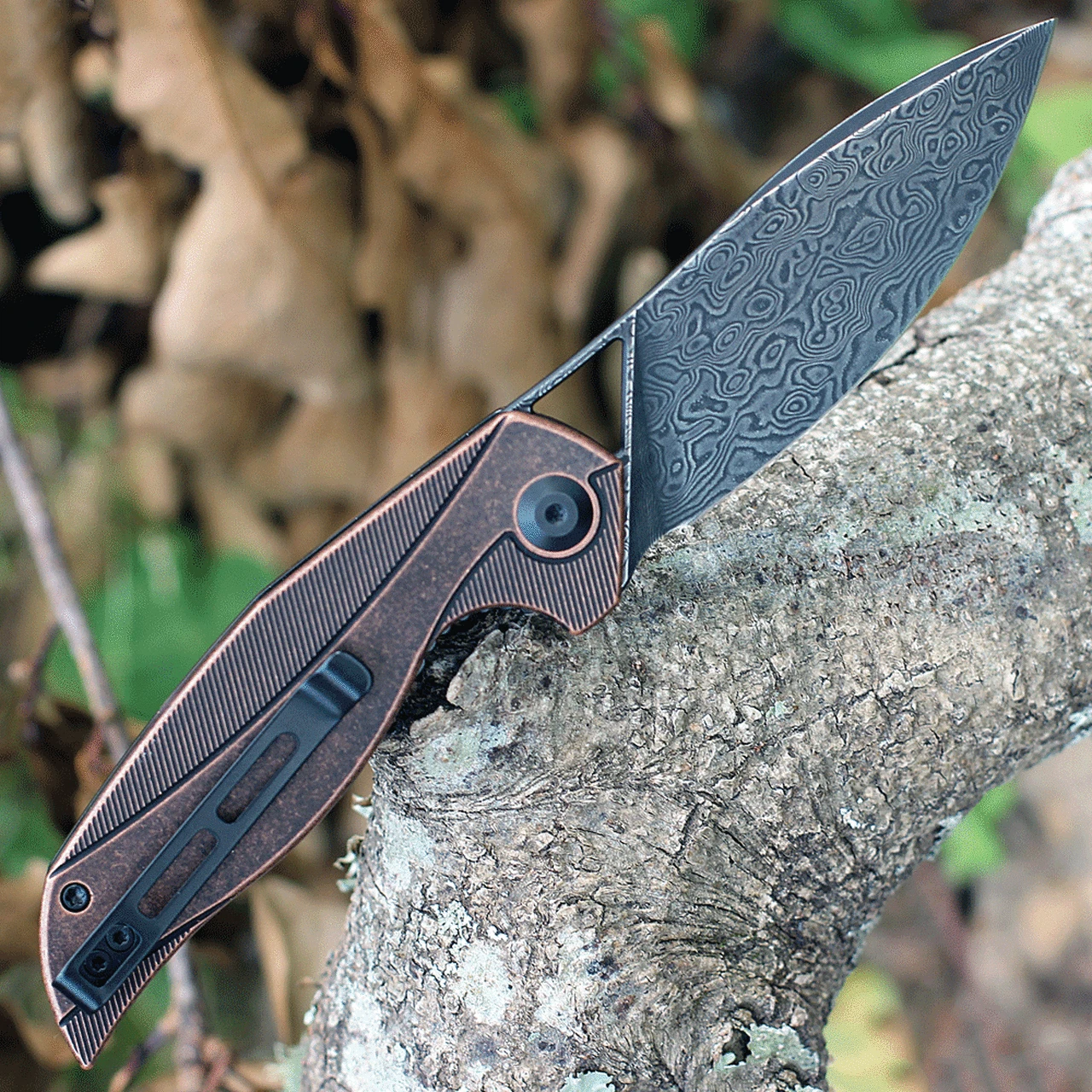 This model of the CIVIVI Anthropos comes with a black damascus steel blade. The handle is comprised of black copper.