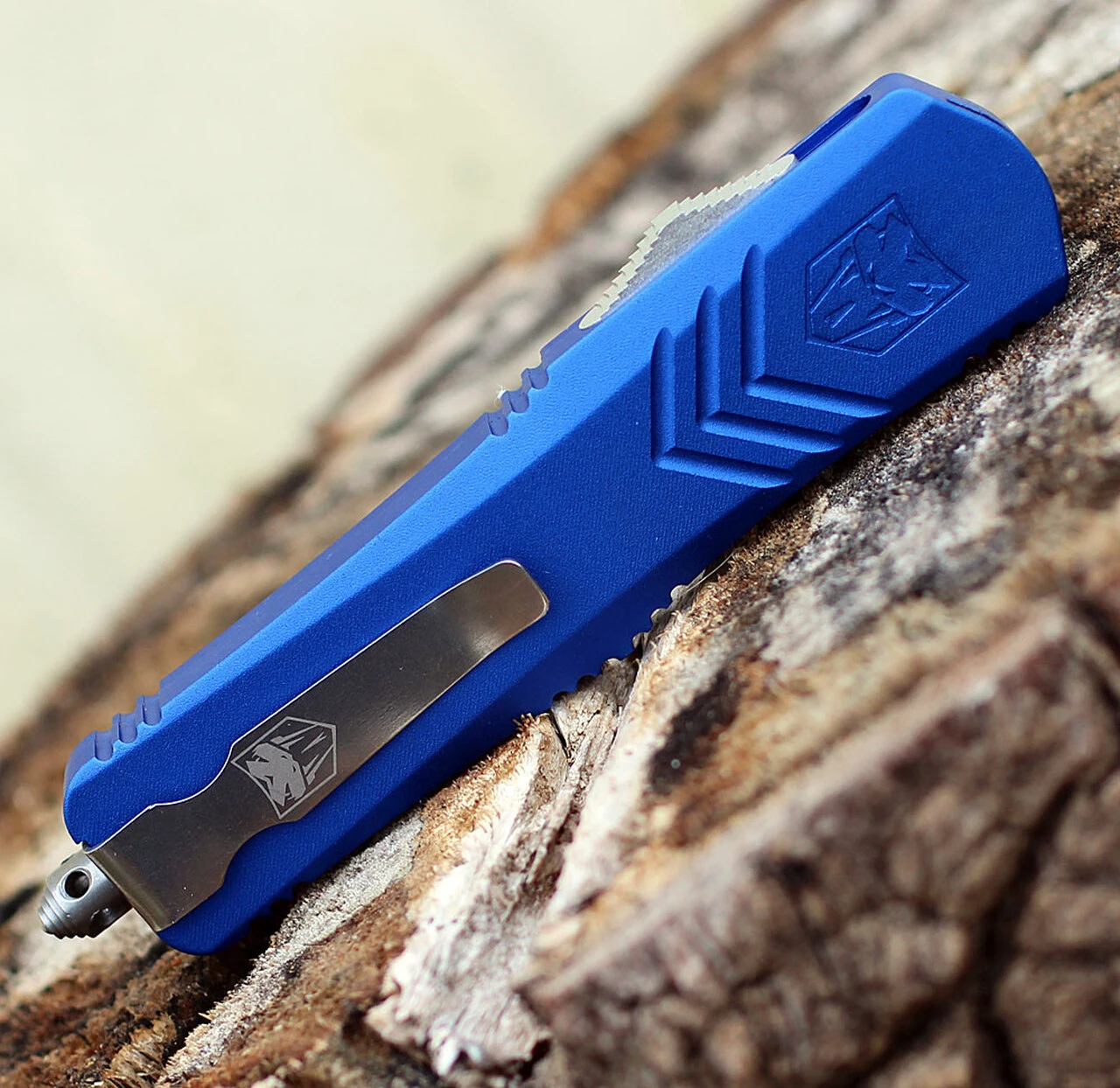 CobraTec Blue FS-X OTF Knife CTKMBLUFS-XMTS, 3″ D2 Steel Tanto Serrated Blade, Blue Aluminum Handle