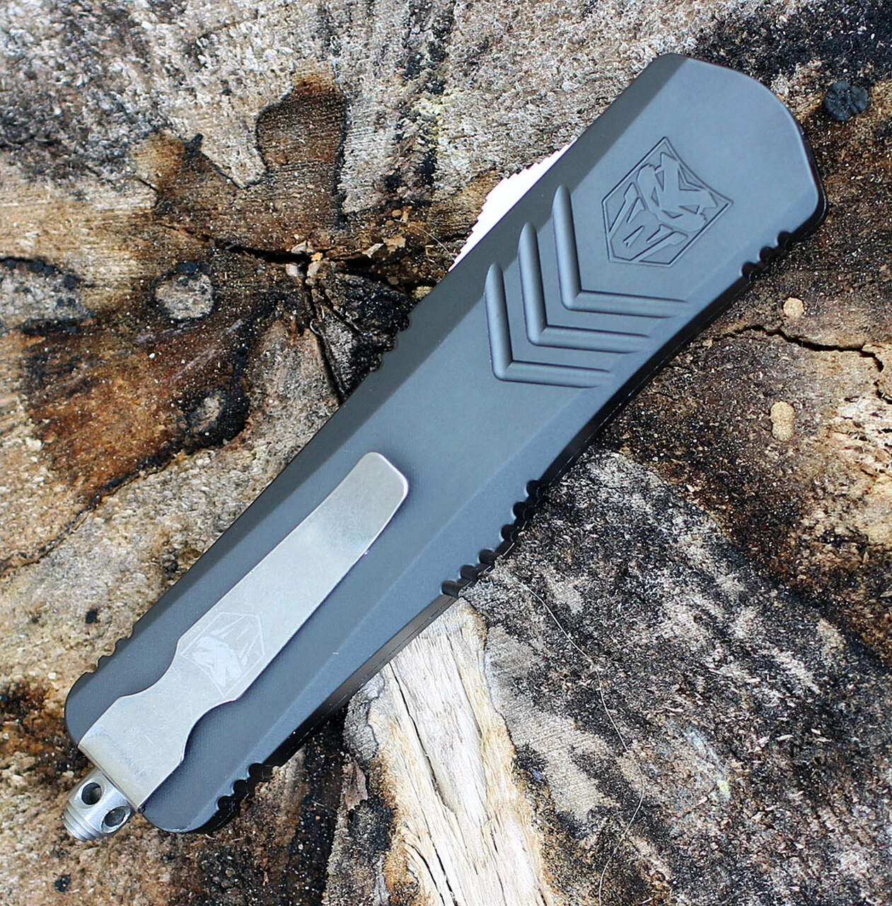 CobraTec Gray FS-X OTF Knife CTKMGRYFS-XMWNS, 3″ D2 Steel Wharncliff Plain Blade, Gray Aluminum Handle
