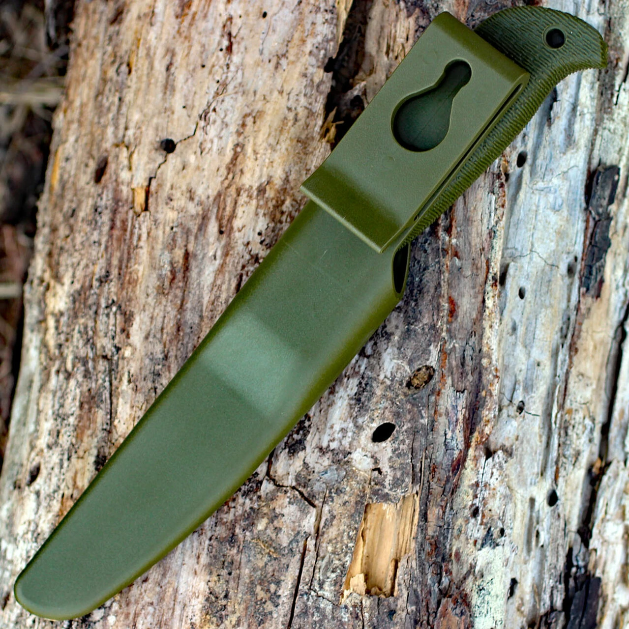 A design collaboration between Andrew Demko and Lynn C. Thompson, the Cold Steel Finn Hawk is the latest in Cold Steels series of inexpensive hard wearing bushcraft and outdoor tools. Its traditional Nordic styled “Scandi Ground” German 4116 steel blade is sub-zero cryo-quenched for superior edge holding potential, with a steep 7.5mm blade bevel and a functional curving belly for skinning and slicing strokes. The 4” blade is more than big enough for most game processing tasks, not to mention for camp chores and food prep too. The Finn Hawk’s handle is two time injection molded. The first layer of high-impact polypropylene is strong, durable and highly weather resistant, while the outer layer (made of TPR rubber) has a whorled spiral pattern providing a food safe, comfortable and secure grip in even the worst conditions. The Finn Hawk is supplied complete with a slim line secure-ex polymer sheath with integrated belt loop.