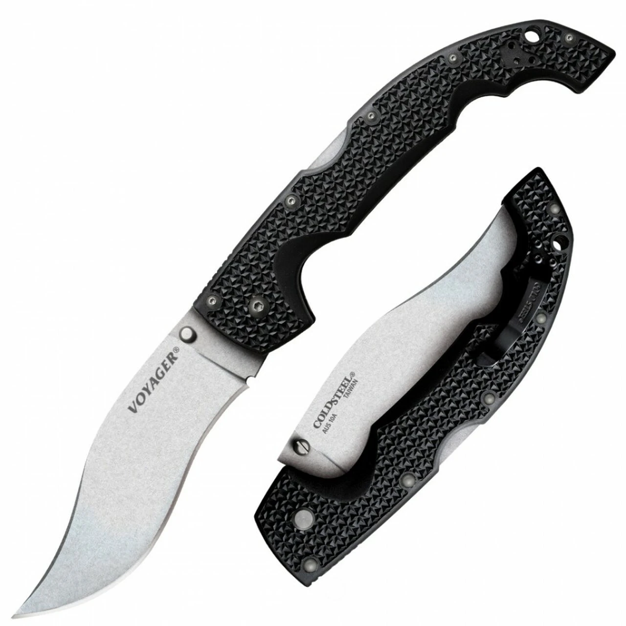 The Cold Steel Voyager series is designed to be the true “everyman” knife. Lightweight, comfortable, super sharp, they are rugged, dependable and perfect for hunting and camping as well as general utility and daily cutting chores. The Voyagers excel in many survival and rescue applications, and they have proven to be very popular with Police and Military personnel, who appreciate the combination of cutting performance and safety that they offer.Each knife in our extensive Voyager series is precision engineered and held to our most exacting standards. Featuring AUS10A Blades, and our Tri-Ad locking mechanism – which is quite possibly the most secure, safe and shock resistant lock on the market today! The Voyagers ergonomic Griv-Ex handles (reinforced with heat treated 6061 aluminum liners) provide both great comfort and a secure grip even under extended use in tough conditions. Available in two sizes and with numerous blade and edge configurations, there’s a Voyager for everyone