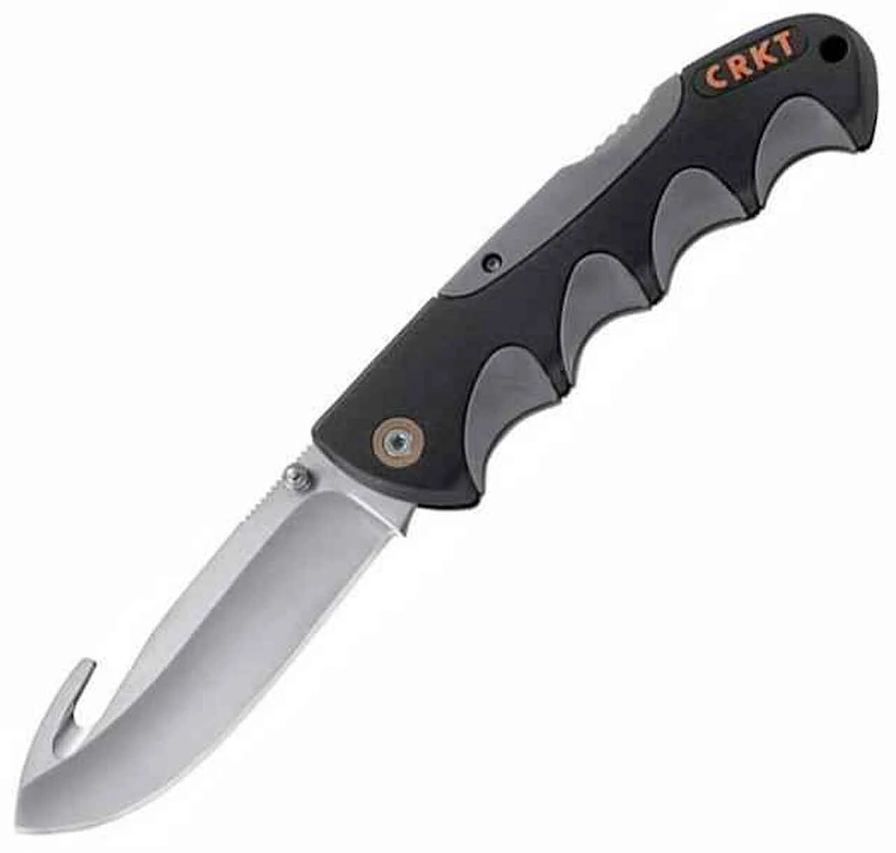 CRKT Free Range Lockback. 5 1/4″ closed. 3 3/4″ 8Cr13MoV stainless guthook blade with thumb stud. Black and gray injection molded polymer handles with finger choils. Lanyard hole. Black nylon belt sheath. Designed by Russ Kommer.