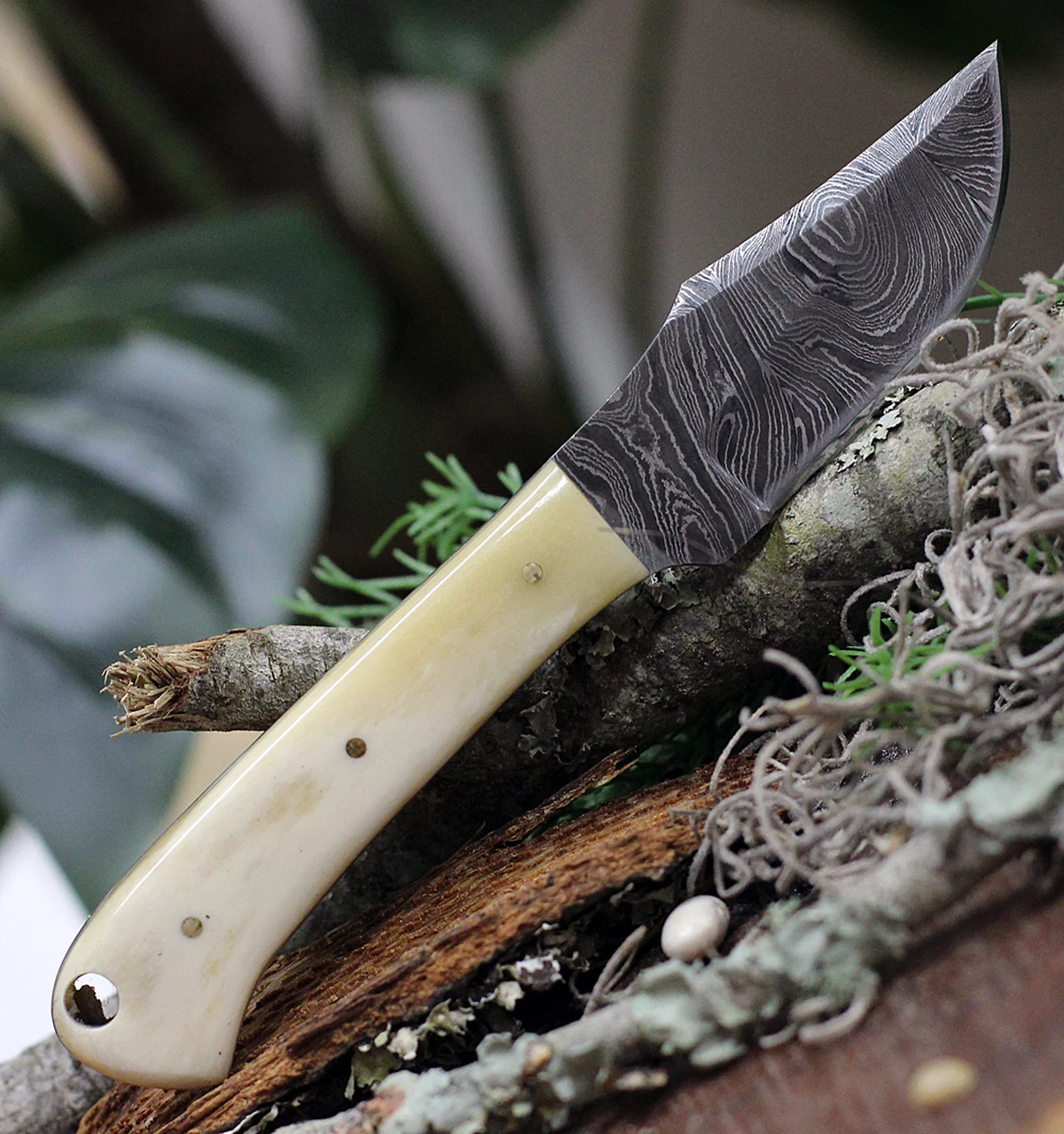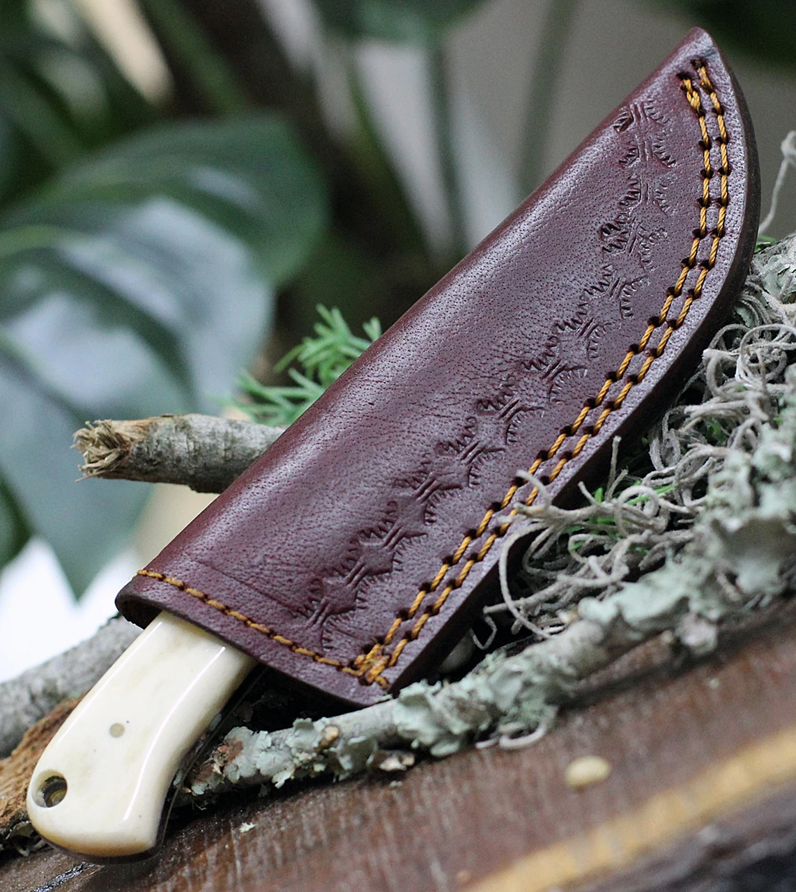 6.5″ overall. 3″ Damascus steel skinner blade. White smooth bone handle. Full tang. Lanyard hole. Brown leather belt sheath.