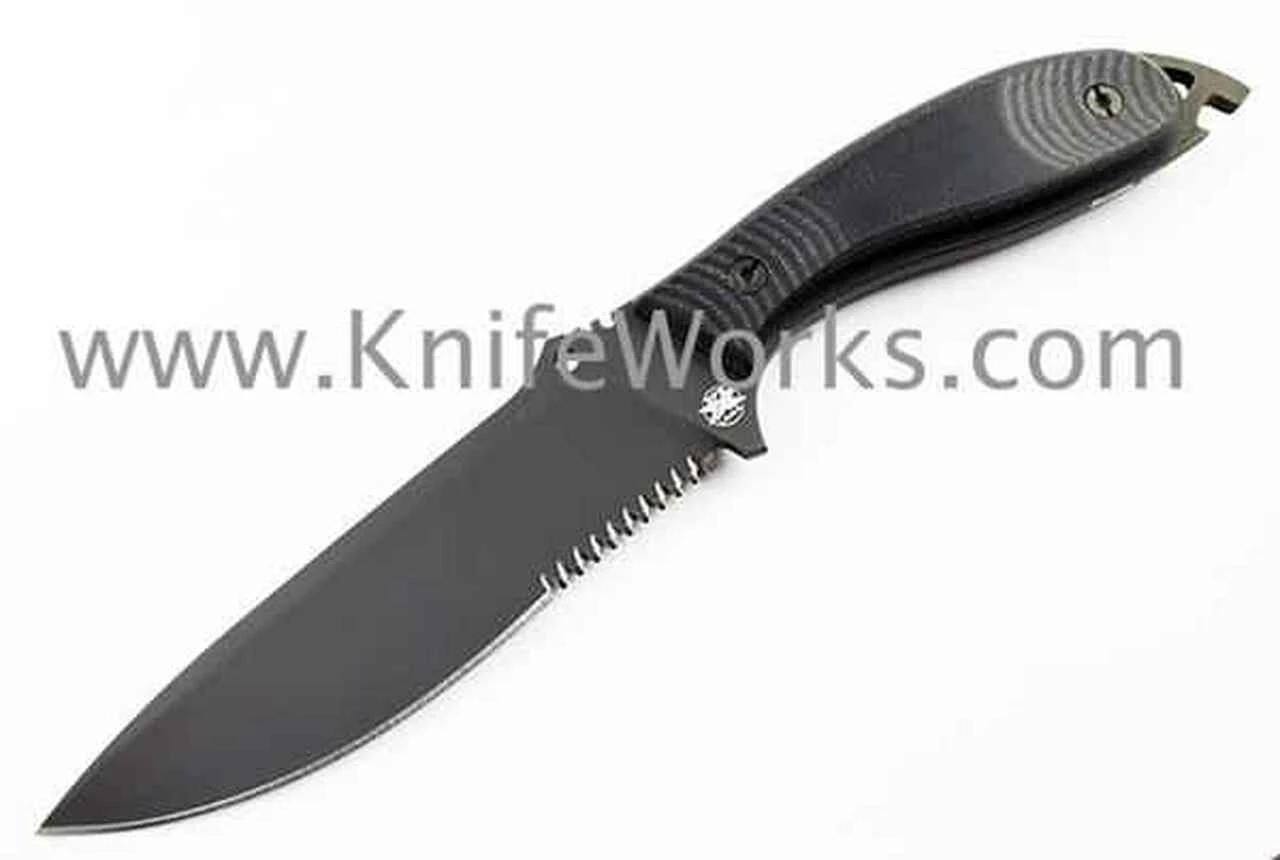 DPX HEFT 6 Assault (Hostile Environment Field Tool). 11 1/4″ overall. 6″ black PVD TICN coated Sleipner tool steel blade hardened to HRC60. Full tang Partial Serrated. The back of the blade is 0.2″ (5mm) thick and features three sizes of wire strippers that also serves as jimping. Integrated striker pommel, pry bar, lanyard hole and lashing point. Black G10 hollow handles with storage. 304 stainless steel hybrid slotted/Allen screws. Black Cordura belt sheath with utility pocket. The Assault is a low-profile, super-durable combatives tool. The PVD black-coated blade has a very low visual signature, making it an excellent choice for law enforcement and military use. Designed by Robert Young Pelton and Tommaso Rumiciand.