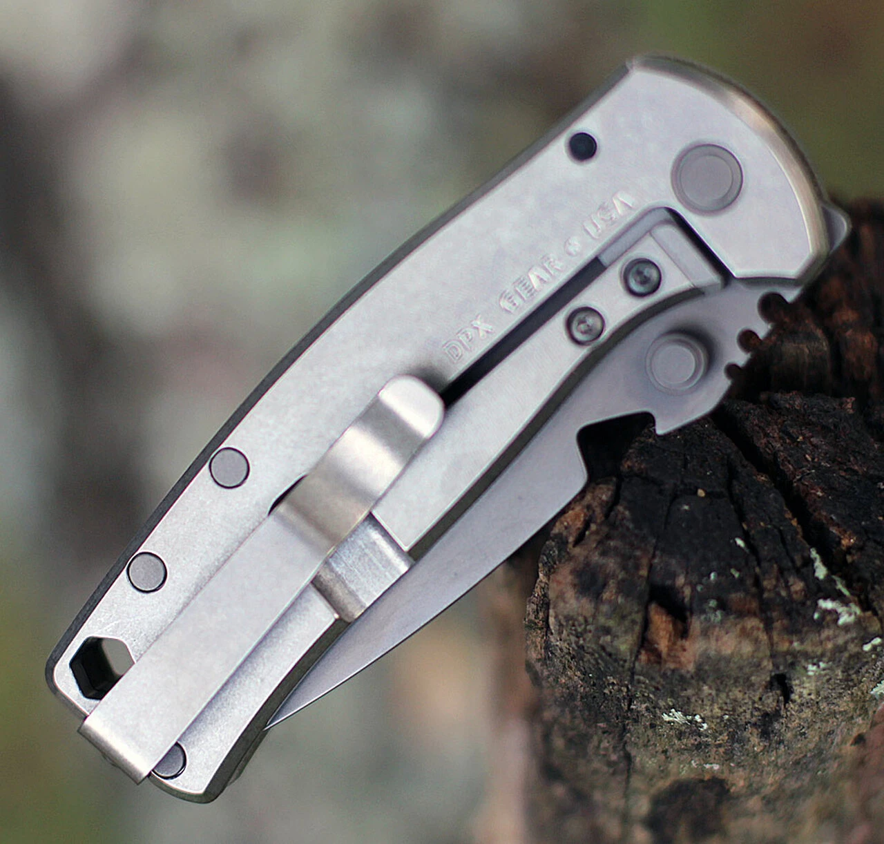 - Fully reversible, deep carry pocket clip. A deep pocket clip bent from heat treated grade 6 Ti alloy means your pocket knife rides as low and unobtrusively as possible in your pocket. The angle of the clip over the frame lock adds additional support to the lock. The DPx HEST/F Urban is made from not just durable materials, but stain free materials. Even the clip, screws and hardware are designed to take harsh environments with ease.