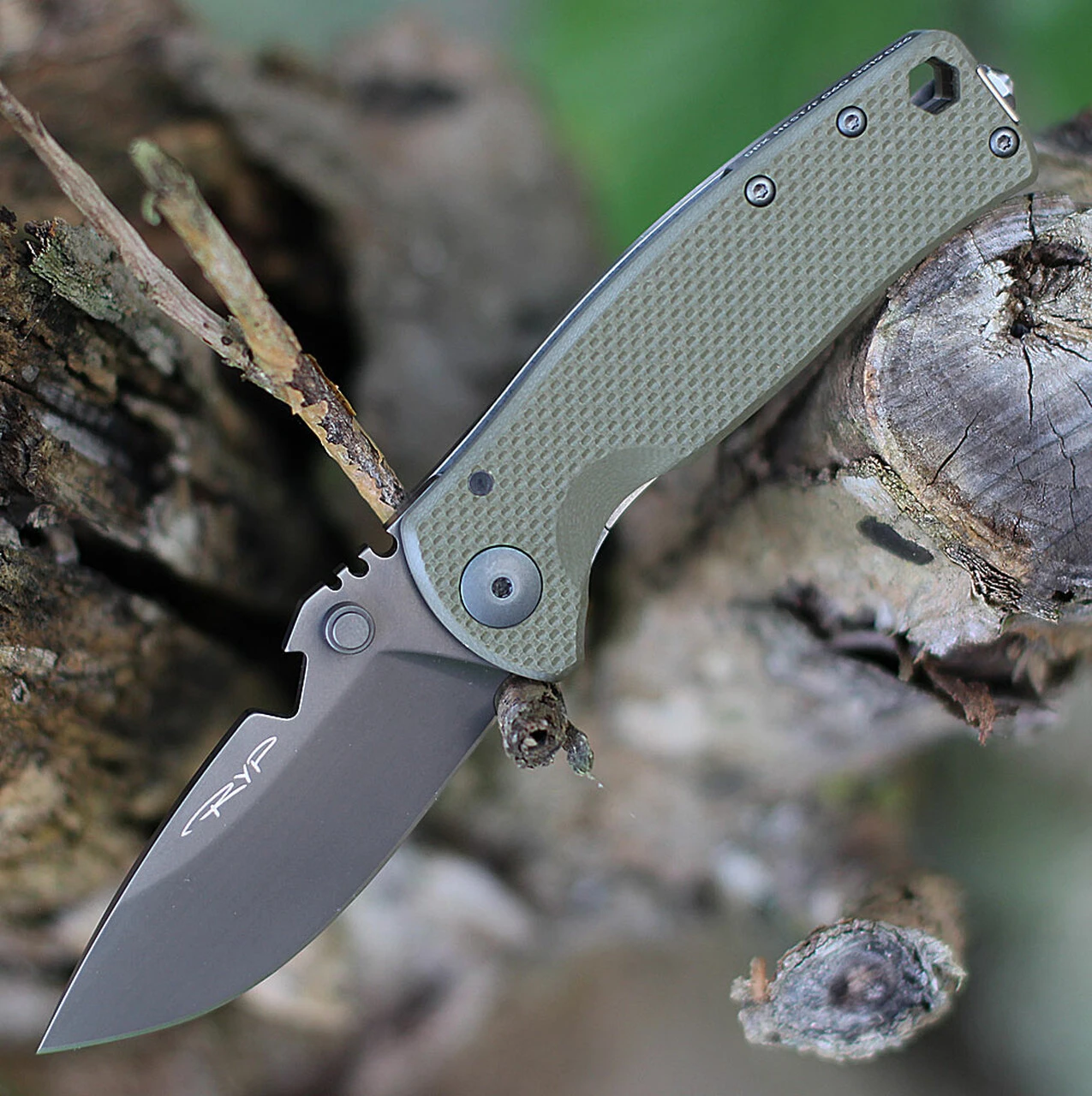 The Urban G10 in Olive Drab features a rough finish G10 frame side and a stone washed raw Ti side. The hardware is 440 Stainless and the high saber grind blade is our new Ghost Grey matte finish PVD.