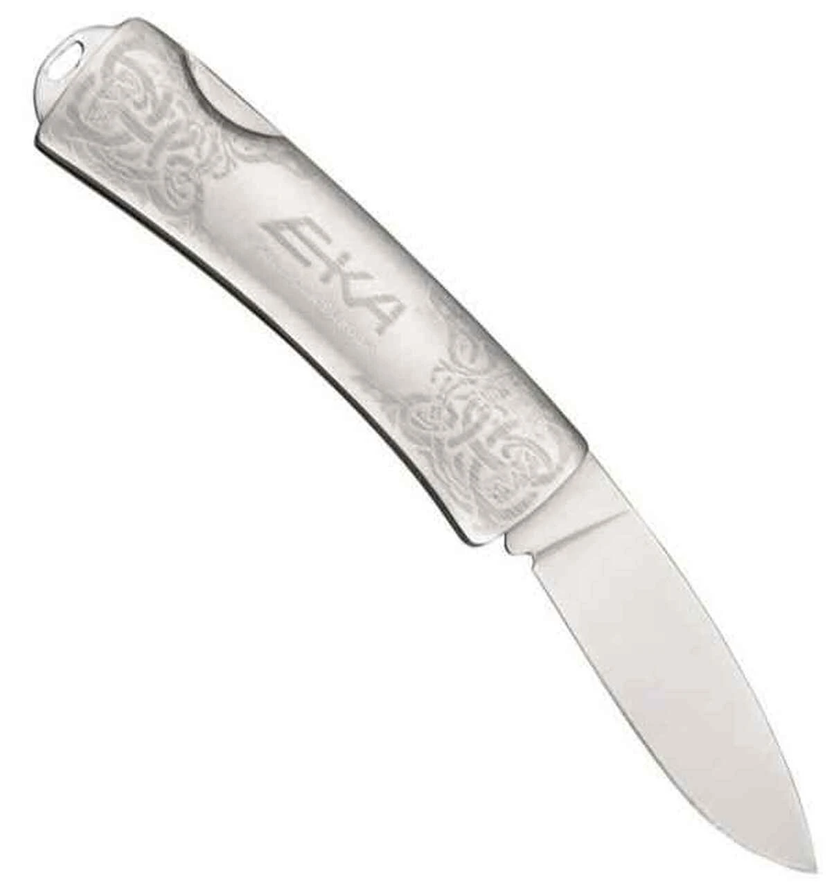 EKA Classic 5. 3 1/2″ closed lockback. 2 3/8″ stainless drop point blade. Matte finish stainless handles with decorative scroll etching. Front handle has castle artwork and back handle features EKA logo. Lanyard hole. Black leather slip pouch.