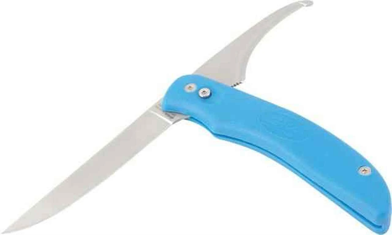 EKA FishBlade Fillet/Gutting Knife. Unique design swingable Sandvik 12C27 stainless blade. Blade is easily interchanged by pushing button lock on handle. The blade that is not in use stores neatly inside the handle. Measurements: 9 1/8″ overall with 4″ fillet blade; or 8″ overall with 2 3/4″ inversed guthook blade. Light blue textured PROFLEX sure-grip rubberized handles. Hinged black composition belt sheath.