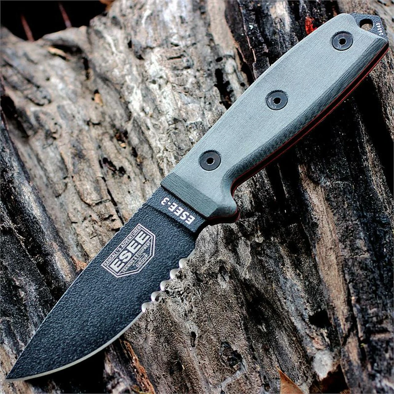The ESEE Model 3 has a black blade that measures 3.88″ and has a partially serrated edge.