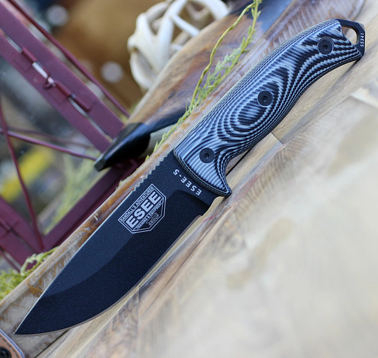ESEE-5 5PB-002, 5.25″ 1095 Carbon Steel Black Plain Blade, Gray/Black G10 3D Handle, Black Kydex Sheath