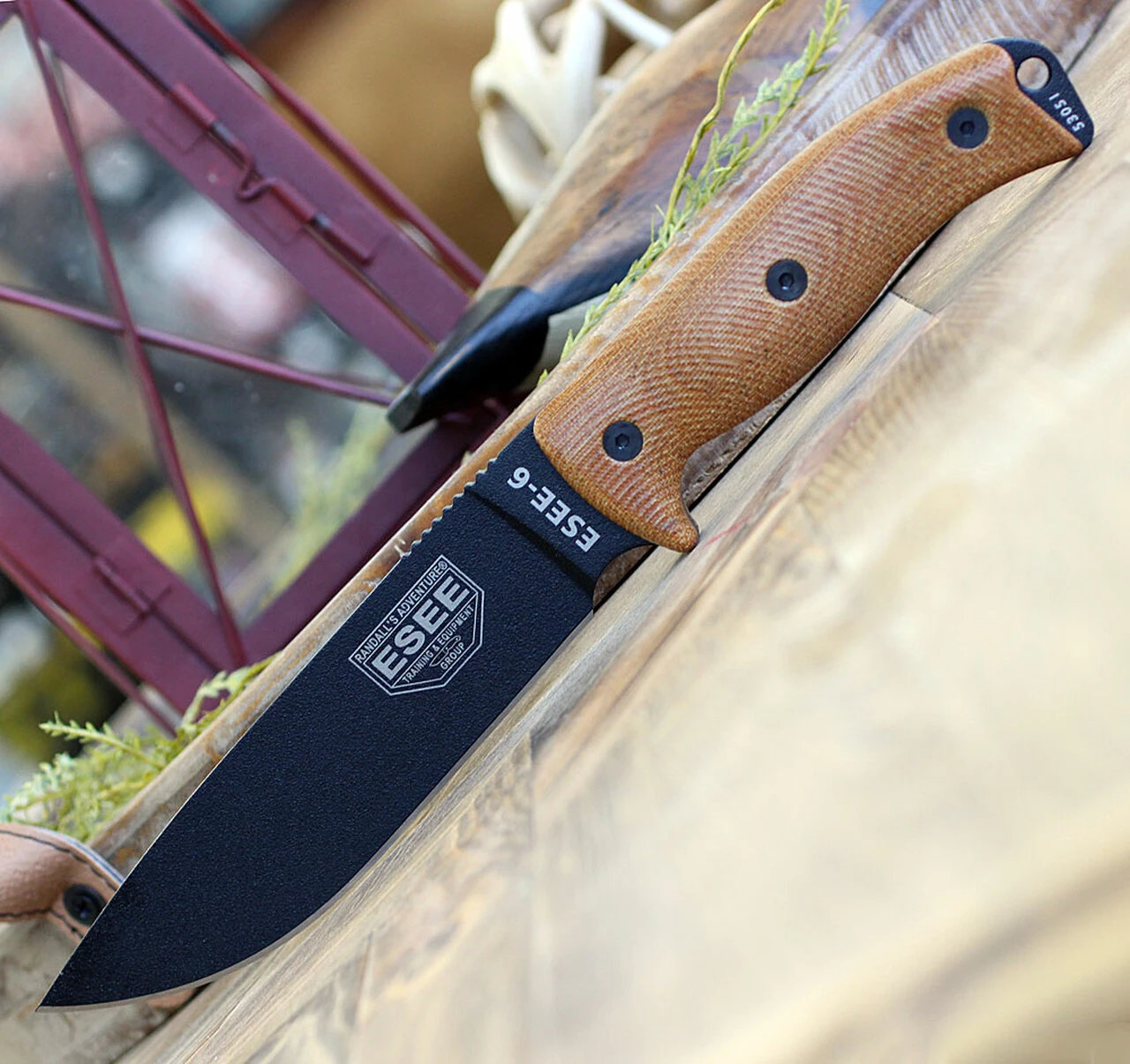 ESEE-6 6PB-011, 5.75″ 1095 Carbon Steel Black Plain Blade, Natural Canvas Micarta 3D Handle, Black Kydex Sheath