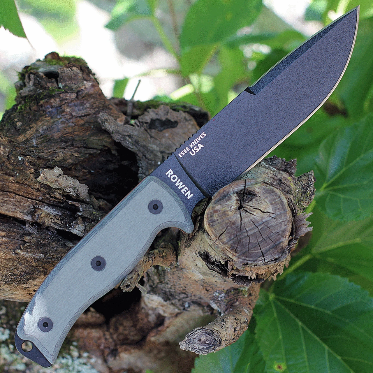 The ESEE-6P-CP fixed blade knife features grey linen Micarta scales and a black finished blade with a plain cutting edge and sharpened upper edge. Includes an black molded sheath, clip plate, paracord and cord lock